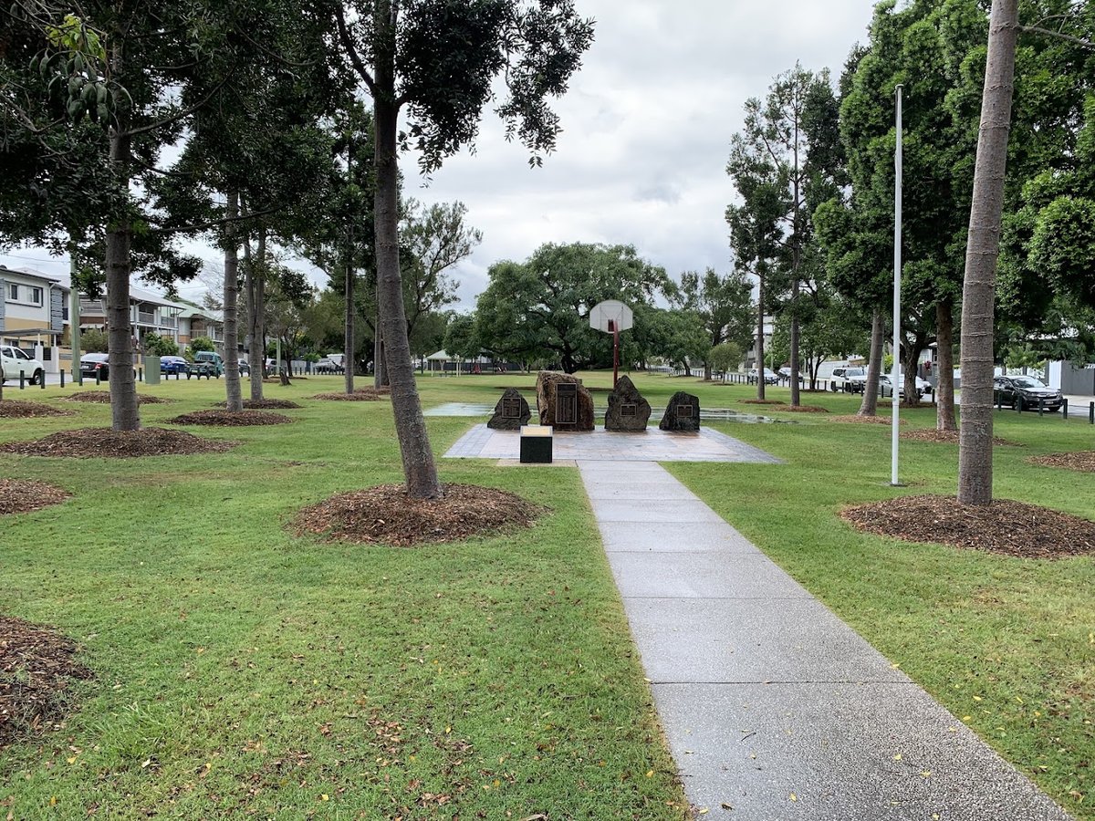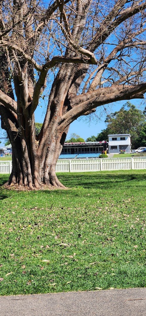 Hickey Park, located in Australia, is a sprawling multi-purpose recreational area that caters to a wide variety of community needs. The park features a dedicated, fully fenced dog exercise area equipped with various agility obstacles, including a tunnel, A-frame, and weave poles, all set upon a well-maintained grass surface. Beyond the dog-specific zone, the park offers expansive green spaces, including a large sports oval used by the Wilston Grange AFC, which is bordered by a classic white picket fence and features stadium lighting and seating. Natural beauty is abundant, with a serene creek running through the property and numerous large, mature trees providing significant shade across the grounds. For families, there is a playground area and a basketball hoop, while concrete paths connect different sections of the park, making it accessible for walkers. Additional amenities include park benches for resting and a dedicated parking lot. The overall atmosphere is one of a vibrant, well-utilized community hub that balances active sports facilities with peaceful natural environments and specialized pet areas.
