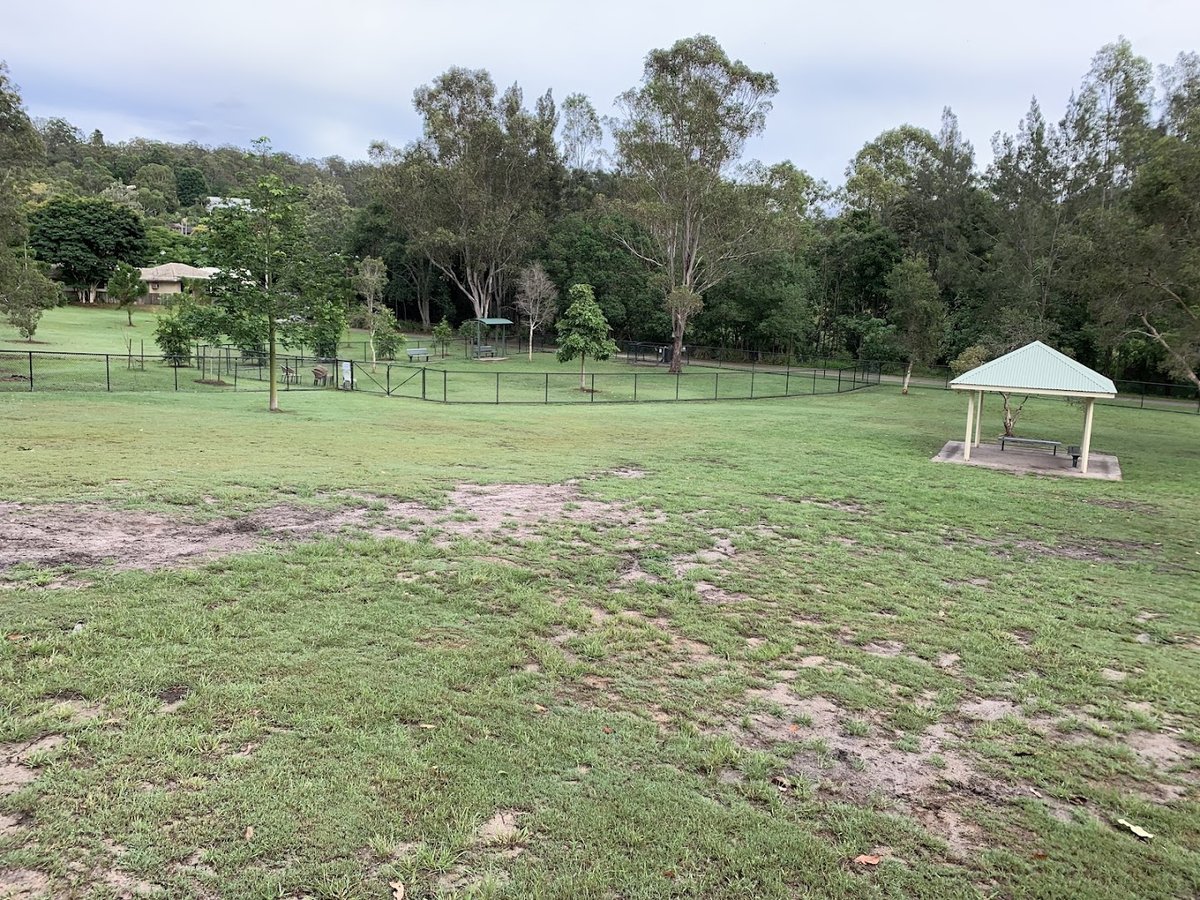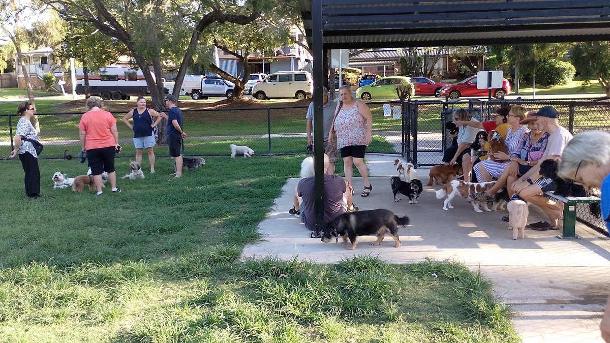 Wittonga Dog Park is a spacious and well-maintained off-leash facility located in a leafy suburban setting. The park features expansive fenced areas that provide ample room for dogs to run and socialize. The primary ground surface is grass, though some high-traffic zones near entrances and seating areas consist of dirt or concrete. Mature trees throughout the park offer natural shade, complemented by several man-made gazebos equipped with benches for owners to rest. The park is secured by sturdy chain-link fencing and includes safety features like double-gate entry points. Beyond the fenced dog enclosures, the wider park area includes excellent amenities such as picnic tables, a barbecue grill, and trash cans, making it a versatile spot for families. A dedicated parking lot is visible adjacent to the park, ensuring easy access for visitors. The atmosphere is vibrant and community-focused, as evidenced by the groups of local residents and their pets. While the terrain is mostly flat, there are gentle slopes in certain sections. The combination of open space and functional facilities makes it a popular destination for dog owners in the area.