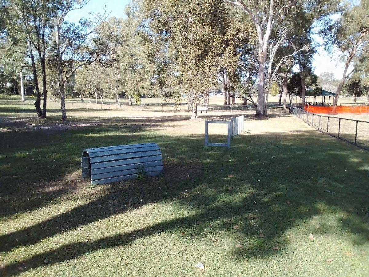 Kiawanah Park Dog Off-leash Area is a spacious and well-maintained facility located in Australia, featuring expansive grassy fields that are perfect for high-energy play and exercise. The park is fully enclosed by secure chain-link fencing, providing a safe environment for dogs to roam freely off-leash. It is notably equipped with various agility features, including a wooden tunnel, hurdles, and weave poles, which cater to dogs of all skill levels. Mature trees are strategically scattered throughout the park, offering plenty of natural shade for both pets and their owners during sunny days. For human visitors, several sturdy benches are positioned on concrete pads, and trash cans are conveniently located for waste disposal. The terrain is predominantly flat with very gentle undulations, and the surface consists of natural grass that remains lush, though it may collect water in small puddles after rainfall. The overall atmosphere is serene and open, bordered by dense greenery, making it an excellent destination for socialization and outdoor activity in a tranquil parkland setting.