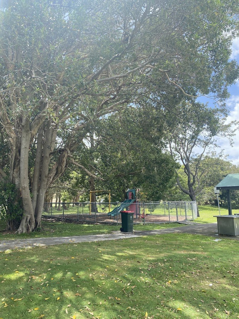 Atkin Park dog park offers a spacious and well-equipped environment for dogs and their owners. The facility features a large, fully fenced off-leash area with a variety of agility equipment, including a concrete tunnel, a wooden A-frame, and weave poles, all set on a lush grass surface. The park is well-shaded by numerous mature trees, particularly around the edges of the activity area. For human visitors, the park includes a separate fenced playground for children, a sheltered picnic area with tables, and BBQ facilities. Trash cans are provided to help maintain cleanliness. The overall atmosphere is open and inviting, providing plenty of room for dogs to run and play. While the park is located near a scenic coastline, the dedicated dog exercise area is situated within the grassy parkland. The combination of functional dog equipment and family-friendly amenities makes it a versatile community space for local residents and their pets.