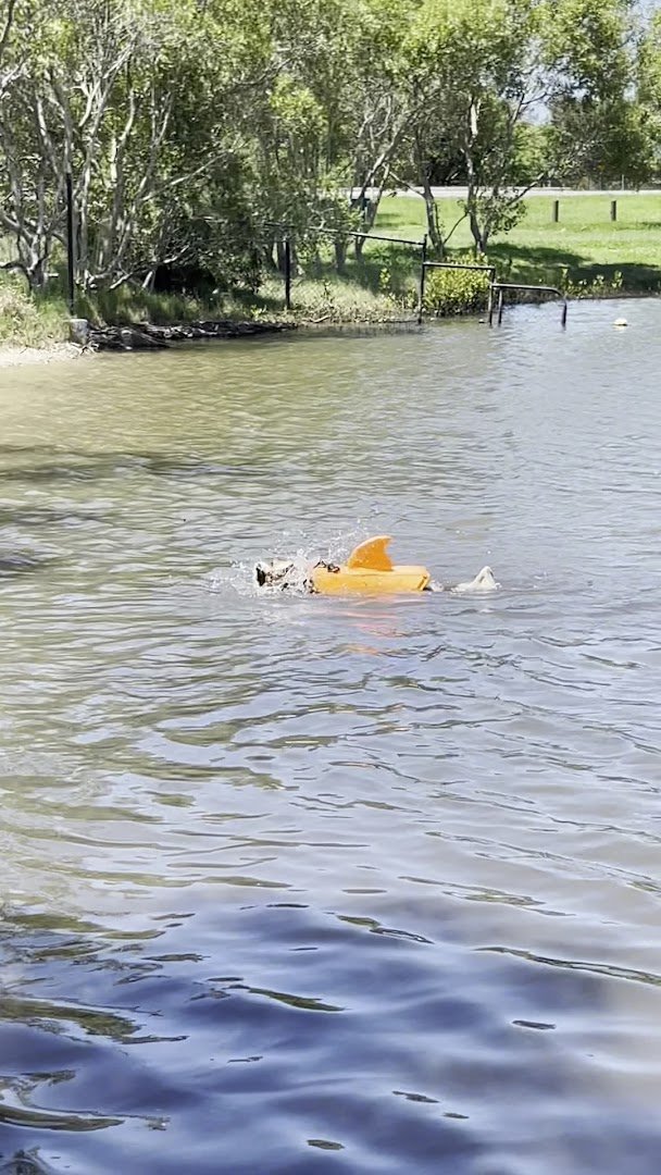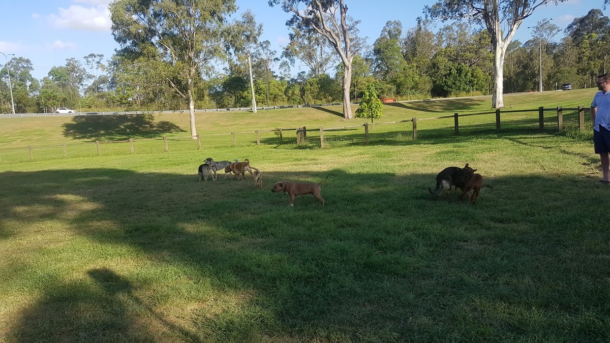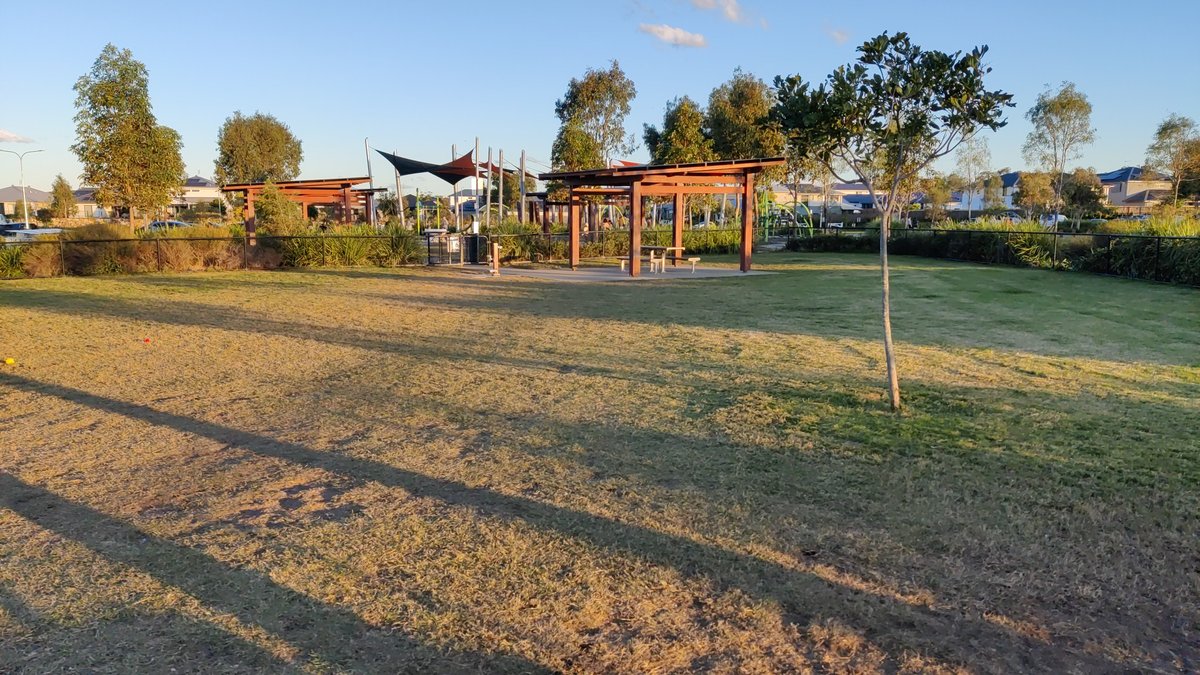 Upper Coomera 2 Fenced Dog Park is an expansive recreational area designed for off-leash exercise. The park is characterized by its large, open grassy fields, which provide ample room for dogs to run and play. The perimeter is fully secured with a mix of post-and-rail fencing reinforced with wire mesh and modern black metal fencing. For human visitors, the park includes a sheltered picnic area equipped with tables, offering a shaded place to sit. While much of the area is covered in grass, some sections appear more natural and overgrown. A significant highlight is the adjacent access to a large body of water, where dogs can enjoy swimming. The park is well-equipped with essential facilities like trash cans to maintain cleanliness. Located near residential neighborhoods and a paved walking trail, the park features a backdrop of mature trees and rolling slopes, creating a pleasant outdoor atmosphere. It also sits near a public playground, making it a family-friendly destination. The combination of wide-open spaces and water access makes it a versatile spot for local dog owners.