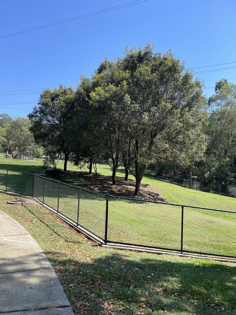 Cashmere Dog Park is a spacious, multi-functional outdoor space located in a scenic, hilly area of Australia. The park features dedicated fenced off-leash areas for dogs, one of which is well-equipped with various agility obstacles including an A-frame, tunnel, weave poles, and jumps. The terrain is predominantly grassy with some natural slopes, providing a good workout for active dogs. Mature trees are scattered throughout, offering patches of natural shade, while a covered picnic shelter provides a man-made shaded spot for owners. Facilities include benches for resting and a nearby playground area with unique equipment like a helicopter-themed rocker, a basketball hoop, and a climbing wall, making it a family-friendly destination. The park is enclosed by secure black chain-link fencing with gated entries. The overall atmosphere is peaceful and open, characterized by its lush green surroundings and views of the local landscape. The presence of both dog-specific zones and general recreation areas makes it a versatile community hub for pet owners and families alike.