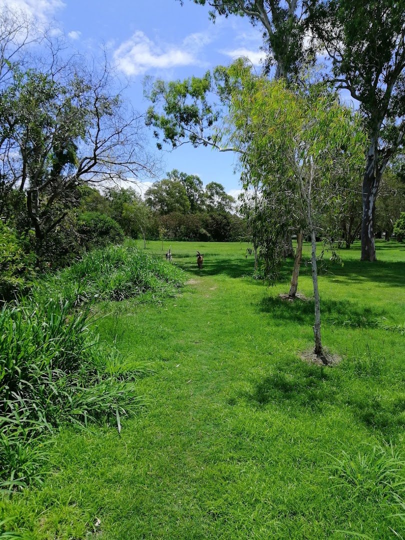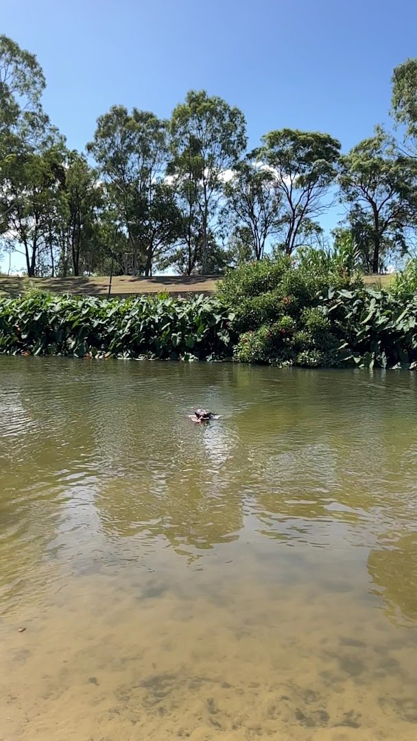 Kedron Brook Dog Walk offers an expansive and picturesque environment for dogs and their owners. The park is characterized by its vast, open grassy fields and a natural creek that provides a popular swimming spot for water-loving canines. Mature trees are scattered throughout the landscape, offering ample natural shade for those looking to escape the sun. For structured play, there is a dedicated fenced-in area equipped with agility equipment, such as an A-frame ramp, allowing for off-leash exercise in a contained space. The park's atmosphere is serene and active, with plenty of room for dogs to run, explore, and socialize. Facilities include sheltered picnic tables and gazebos, making it a comfortable spot for longer visits. The terrain is mostly flat with some gentle slopes leading down to the rocky and sandy banks of the water. While a chain-link fence secures one section, much of the park feels open and integrated with the surrounding natural greenery. It is a well-loved community space that caters to a variety of dog activities, from high-energy fetching to cooling off in the brook.