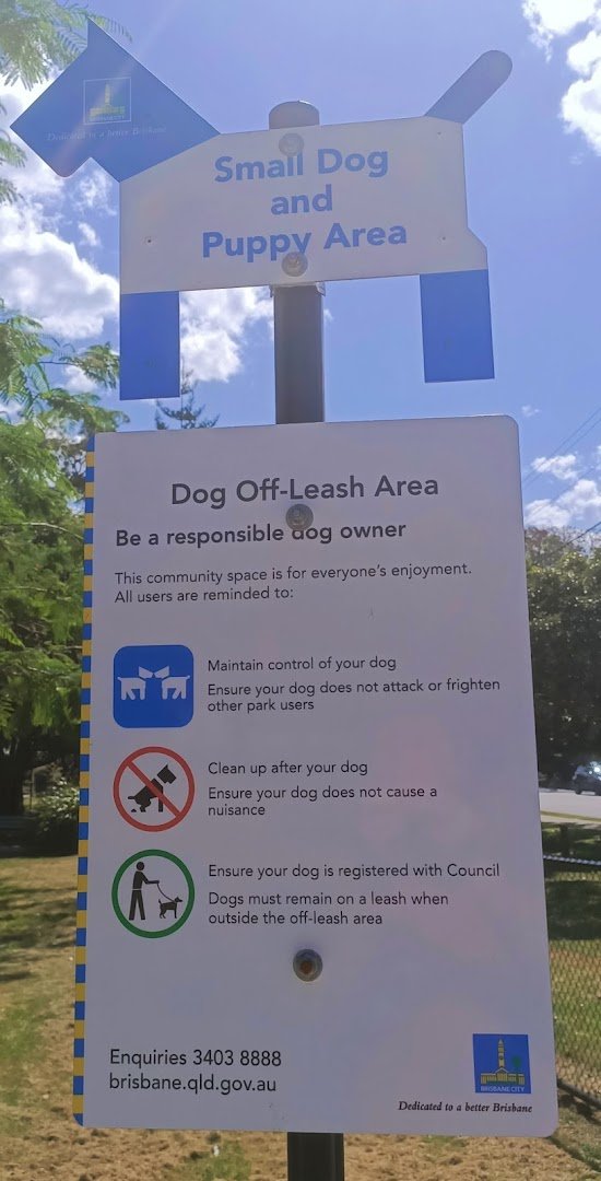Wavell Puppy Park is a well-equipped off-leash facility located in Brisbane, Australia, offering a variety of amenities for dogs and their owners. The park features dedicated sections, including a specific area for small dogs and puppies, ensuring a safe and controlled environment for pets of all sizes. The primary ground surface is well-maintained grass, providing a soft area for running, although some high-traffic spots near equipment show natural wear. The entire off-leash area is securely enclosed by sturdy chain-link fencing, often utilizing double-gate entry systems to prevent escapes. For exercise and mental stimulation, the park includes agility equipment such as a large A-frame ramp. Owners can find convenience in the provided benches and trash cans for waste disposal. Natural shade is plentiful thanks to numerous mature eucalyptus and other trees scattered throughout the expansive, open space. Additionally, the park's location near a natural water body allows for supervised swimming. The overall atmosphere is one of a spacious, community-focused recreational hub, complemented by nearby paved walking paths and picnic shelters for a complete outdoor experience.