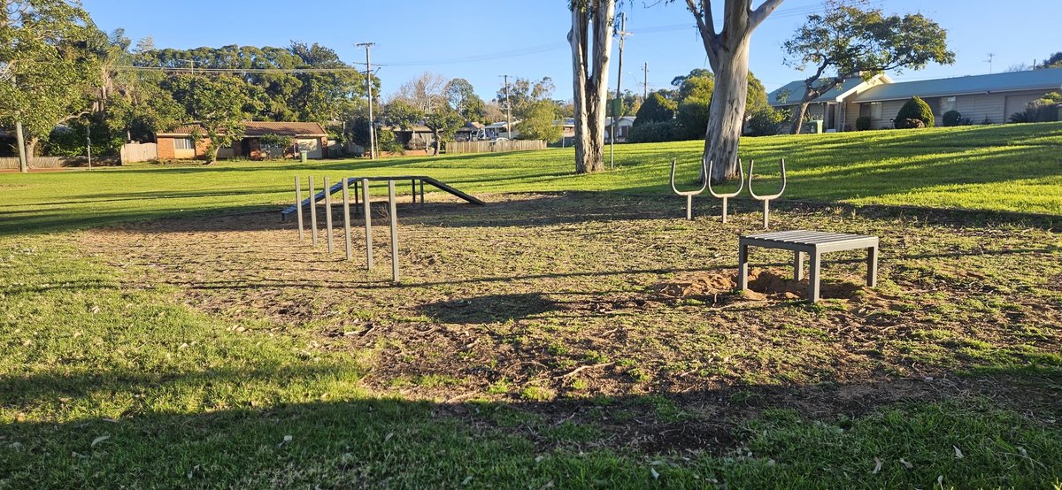 Wilsonton Heights Park Dog Off Leash Area offers a vast, undulating green space perfect for high-energy dogs to run and play. The park is characterized by its expansive grassy fields and a significant number of mature Eucalyptus trees that provide ample natural shade throughout the day. For structured play, the facility includes a dedicated agility section featuring an A-frame, weave poles, and jumping hoops situated on a mixed grass and dirt surface. Human visitors can enjoy the convenience of a sheltered picnic gazebo, several benches, and paved walking paths that meander through the wooded sections. Practical amenities are well-integrated, including a dog-accessible water fountain and waste bins to maintain cleanliness. While the area is designated for off-leash use, it appears to be an open-plan park without a dedicated perimeter fence, bordered instead by residential properties and natural boundaries. The inclusion of bike racks and park lighting suggests it is a well-used community hub. Overall, the atmosphere is serene and spacious, providing a naturalistic environment for both pets and owners to enjoy the outdoors in a suburban Australian setting.