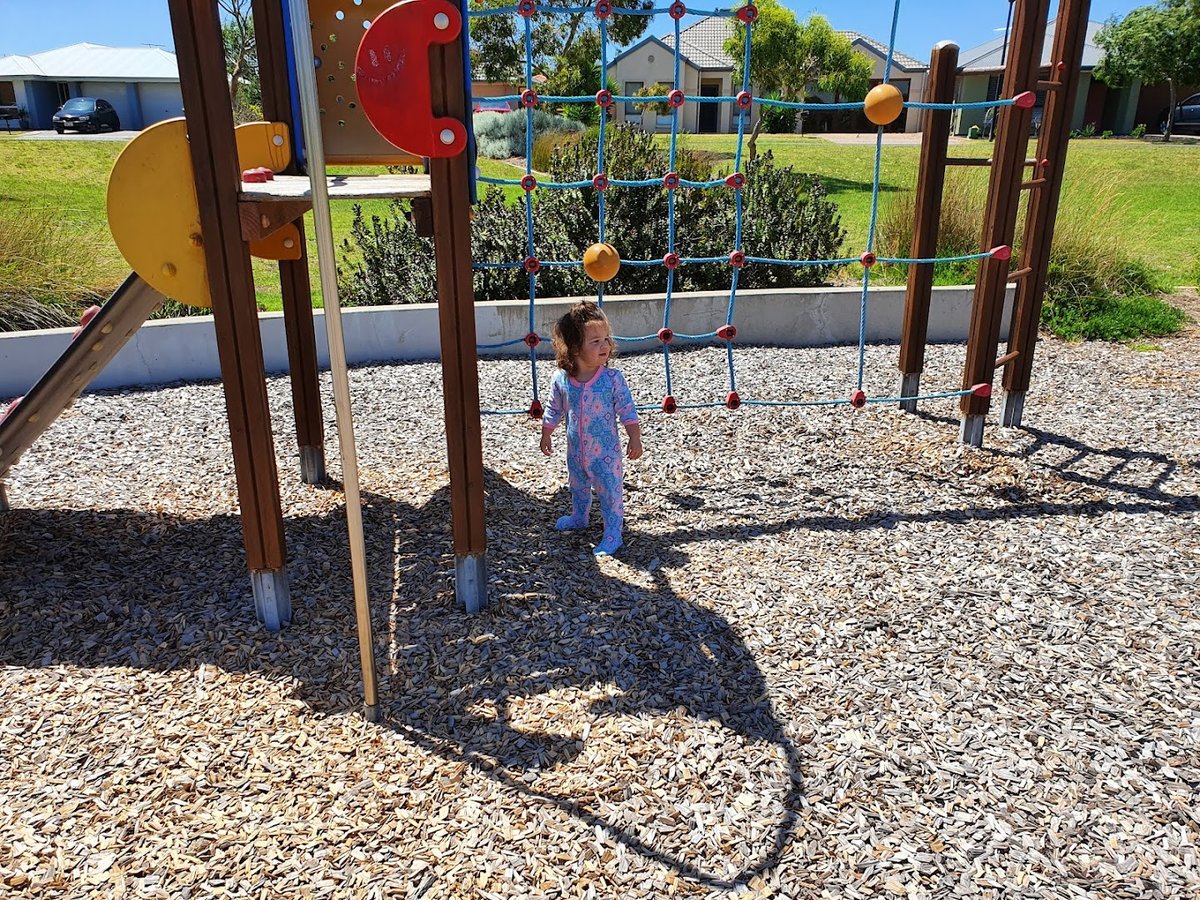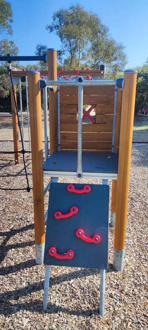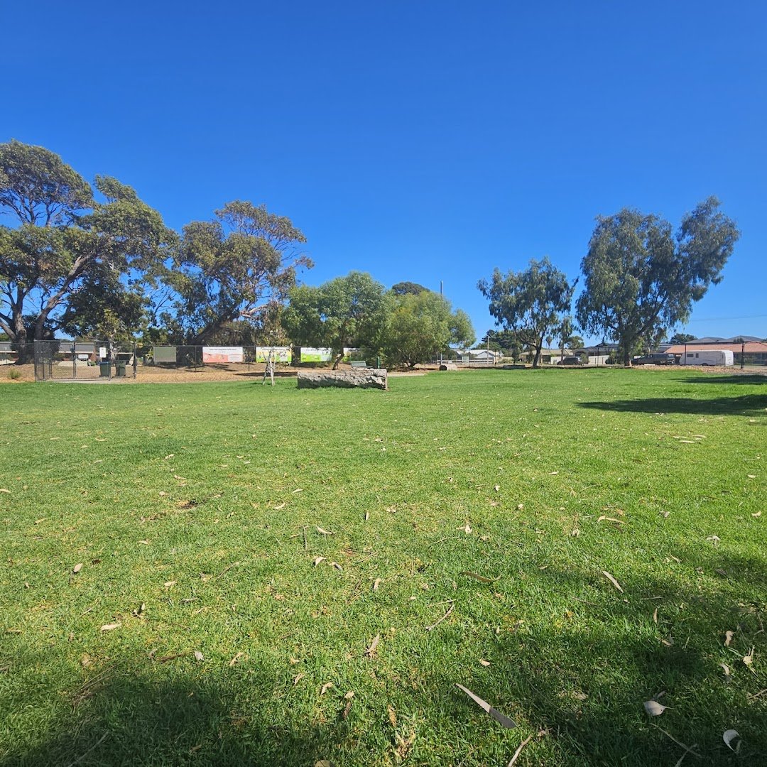 Symonds Reserve Dog Park in Australia provides a versatile outdoor space catering to dog owners and families alike. The centerpiece is a large, fenced-off grassy field designed for off-leash exercise, allowing dogs plenty of room to roam safely. This area is enclosed by a sturdy chain-link fence and includes convenient amenities like trash cans near the entry gates. Mature trees provide patches of natural shade across the lawn, and a large fallen log offers a natural play element for dogs. Beyond the dog-specific area, the reserve features a modern playground with swings, climbing nets, and slides, all situated on a protective mulch surface. For relaxation, visitors can utilize the sheltered picnic area, which contains a table and is surrounded by decorative stone walls and gravel paths. Benches are also strategically placed around the playground and park perimeter. The combination of wide-open green spaces, functional facilities, and dedicated play zones makes it a well-rounded community hub for recreation and pet socialization.