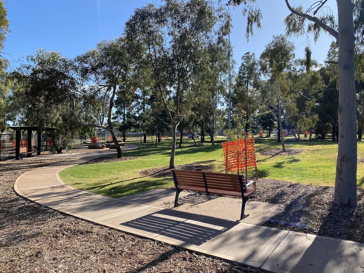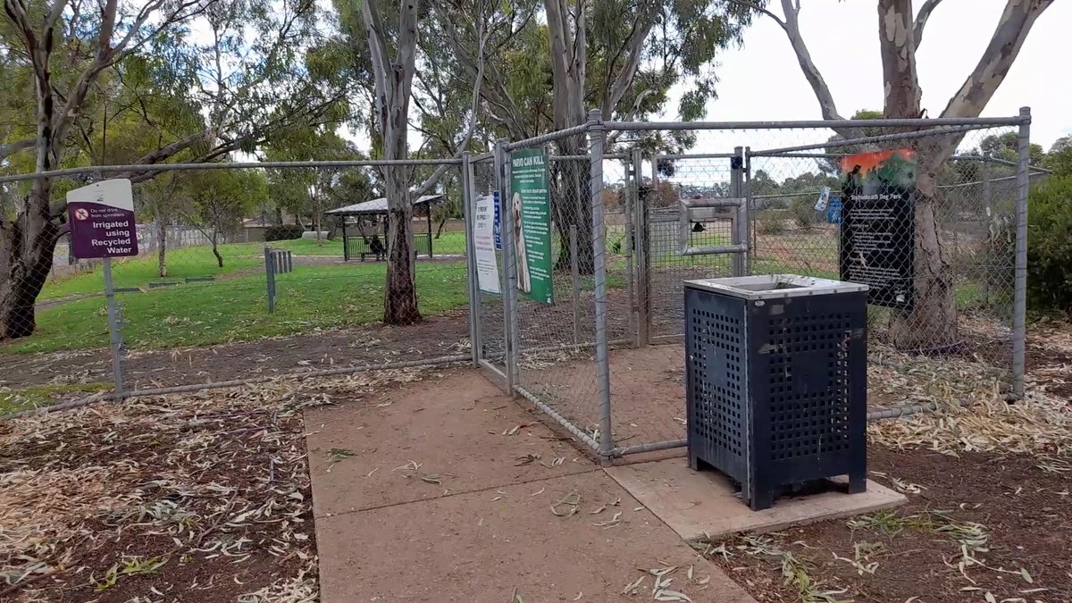 Stebonheath Dog Park in Australia is a spacious and well-equipped off-leash facility designed for canine exercise and socialization. The park features a large, open grassy expanse complemented by sections of dirt and mulch, providing varied terrain for dogs to explore. A secure perimeter is maintained by high chain-link fencing, which includes a double-gated entry system to ensure safety during arrivals and departures. For enrichment, the park includes large concrete tunnels that serve as basic agility equipment. Human visitors can enjoy several amenities, including multiple wooden benches positioned along winding concrete paths and a shaded pavilion for protection from the sun. Mature eucalyptus trees are scattered throughout the grounds, offering significant natural shade and a pleasant, park-like atmosphere. Practical features such as trash cans and informative signage regarding park rules and health warnings are clearly visible. While the park is irrigated with recycled water, specific dog drinking fountains are not immediately prominent in the provided views. The overall environment is peaceful and suburban, bordered by residential streets with available curbside parking.