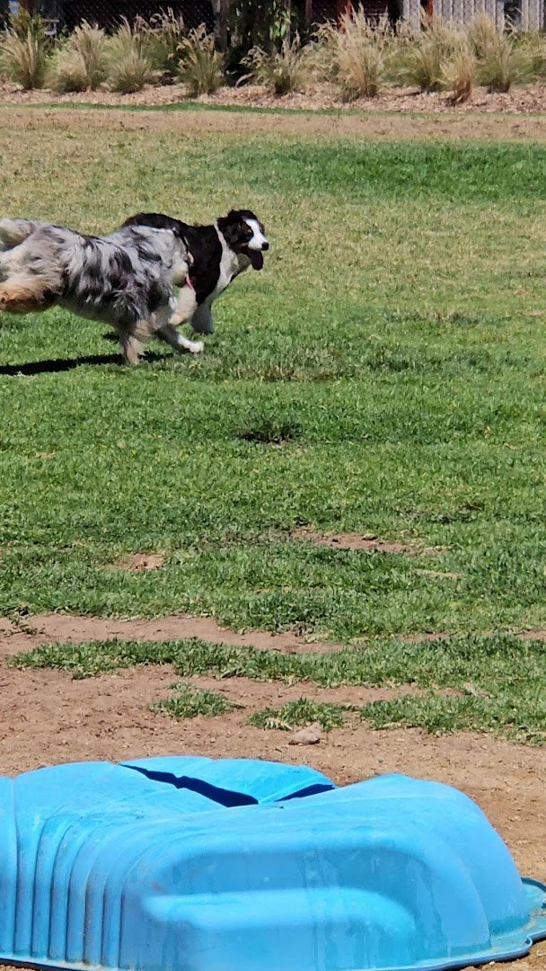 Conyngham Street Dog Park is a spacious, well-equipped off-leash area characterized by its natural setting with numerous mature eucalyptus trees providing ample shade. The park features a mix of surfaces, including large open grassy fields for running and dirt or mulch areas under the trees. For canine enrichment, there are several large concrete tunnels and even a plastic wading pool for cooling off. The facility is fully enclosed by a black chain-link fence, featuring secure double-gate entry points to ensure safety. Human amenities include benches scattered throughout, a sheltered picnic area, and trash cans for waste disposal. The presence of a nearby building with public toilets and adjacent sports courts adds to the park's utility. The atmosphere is open and inviting, offering plenty of room for dogs of all sizes to socialize and exercise in a semi-natural environment.