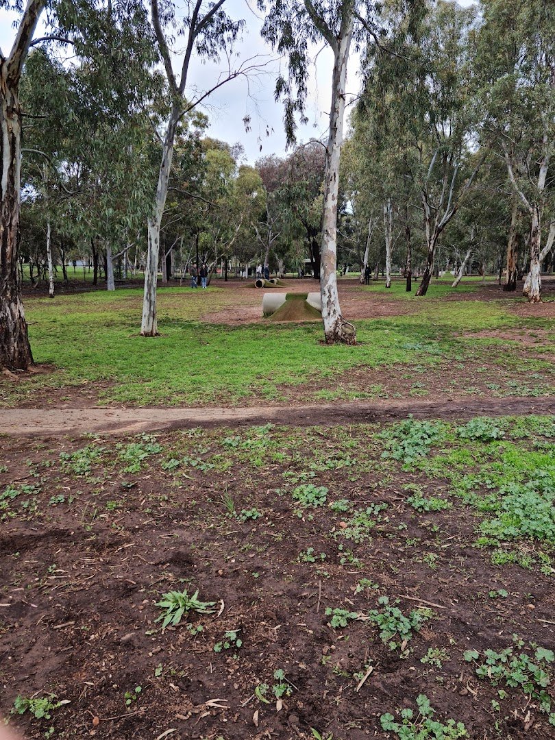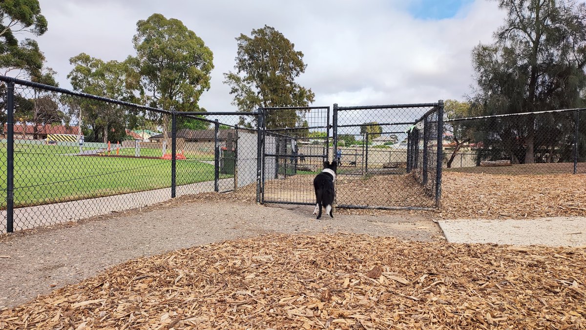 Happy Houndz Adventure Park is a comprehensive and well-designed canine facility that offers a variety of environments for dogs to explore. The park features expansive open spaces with a mix of natural grass, dirt, and dedicated sandy zones, providing diverse sensory experiences. Mature eucalyptus trees are scattered throughout, offering significant natural shade, complemented by a sturdy wooden pavilion with benches for owners to rest. Safety is a priority, evidenced by the high chain-link fencing and a secure double-gated entry system. The 'adventure' aspect is highlighted by unique amenities such as concrete tunnels, climbing platforms, and a bone-shaped splash pool for water play. The park also includes solar-powered lighting, suggesting extended usability. While the main areas are focused on dogs, a nearby children's playground makes it a family-friendly destination. The ground surfaces are thoughtfully varied, utilizing wood chips in high-traffic or play-equipment areas and artificial turf around the water feature to manage mud. Overall, the park provides a spacious, off-leash atmosphere that encourages both active exercise and social interaction in a secure, well-maintained setting.