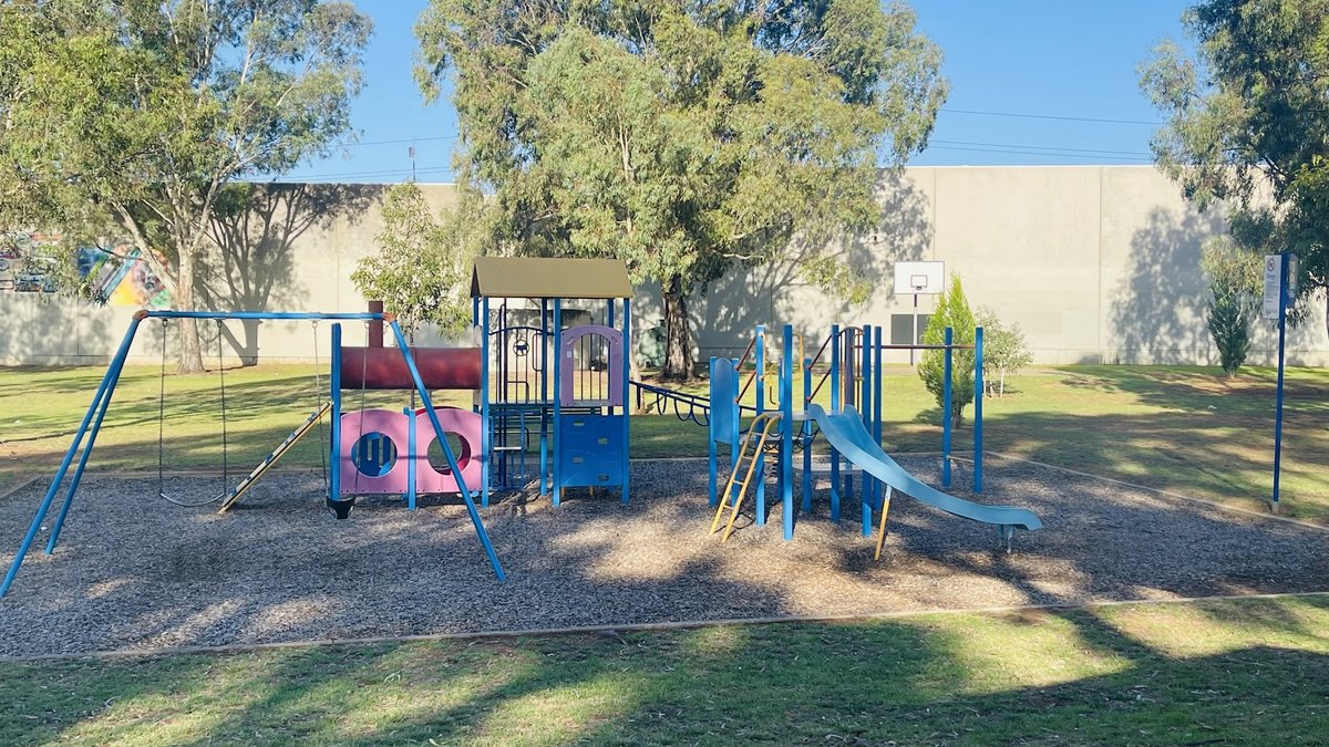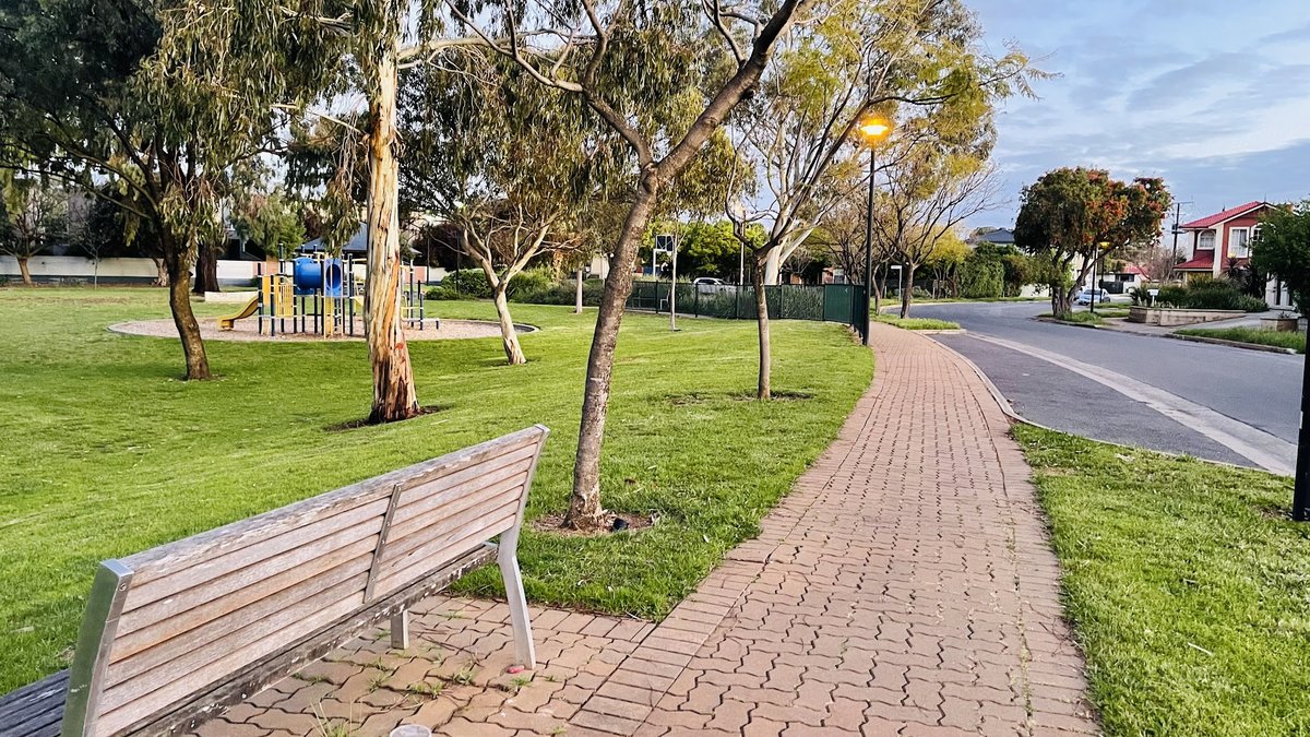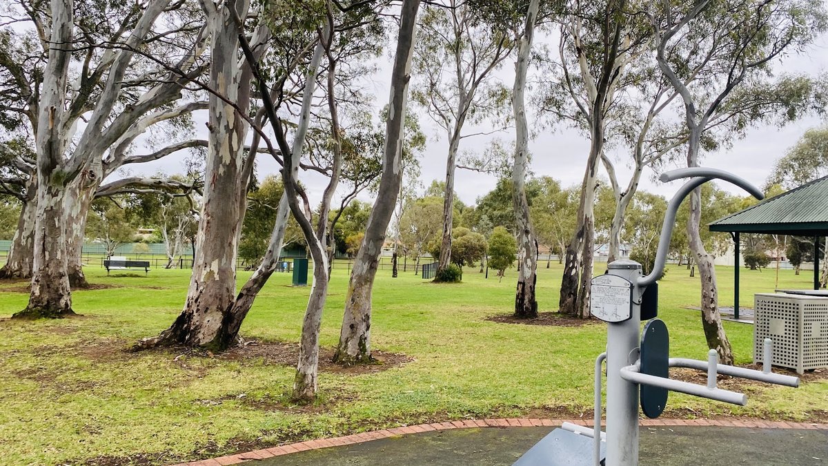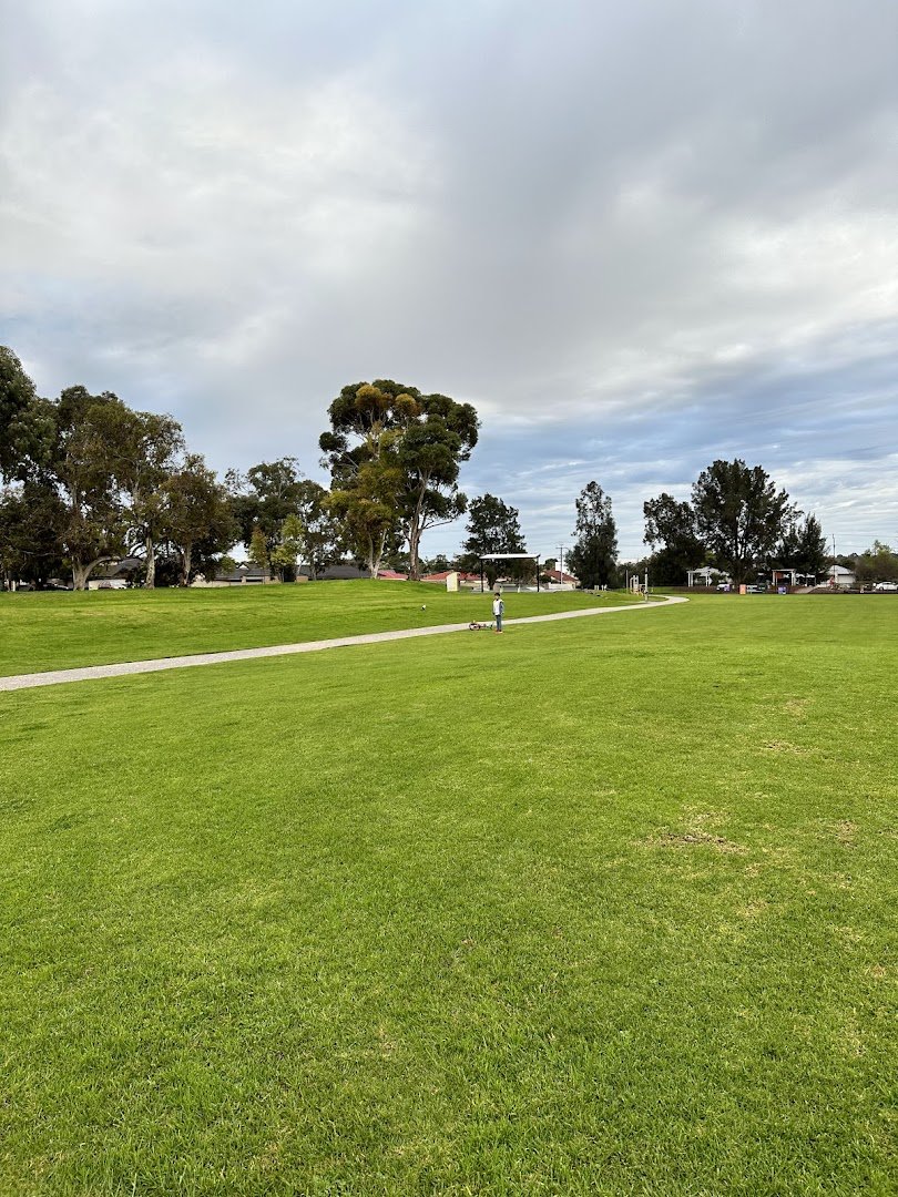 Jack Watkins Reserve is a multi-use community park featuring a dedicated fenced dog park area. The reserve offers expansive open green spaces with a mix of lush grass and some drier patches depending on the season. It is well-equipped with amenities including a children's playground with swings and slides, outdoor fitness equipment, and a sheltered picnic area featuring a BBQ and tables. For dog owners, there is a large, fenced-off section allowing for off-leash exercise. The park is characterized by numerous mature eucalyptus trees that provide ample natural shade across the grassy fields. Paved and brick pathways wind through the reserve, making it accessible for walking and scooters. Additional facilities include park benches for resting, trash cans for waste disposal, and street lighting for evening visibility. The overall atmosphere is family-friendly and spacious, catering to both recreational activities and pet exercise within a suburban setting.