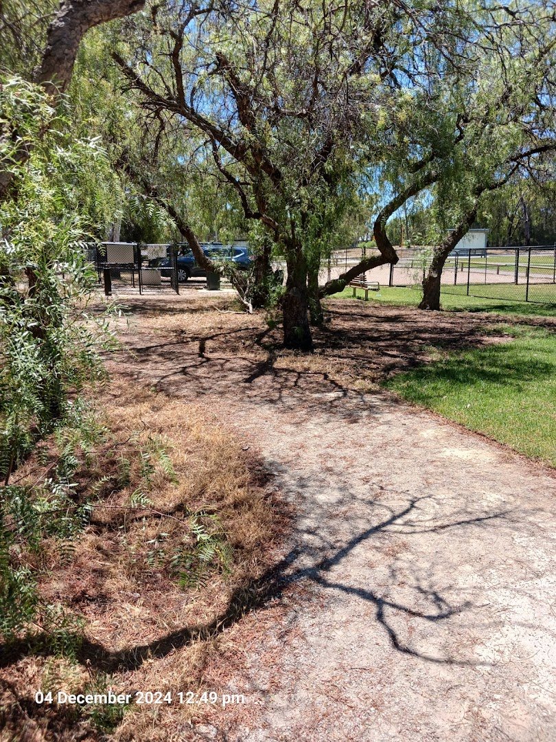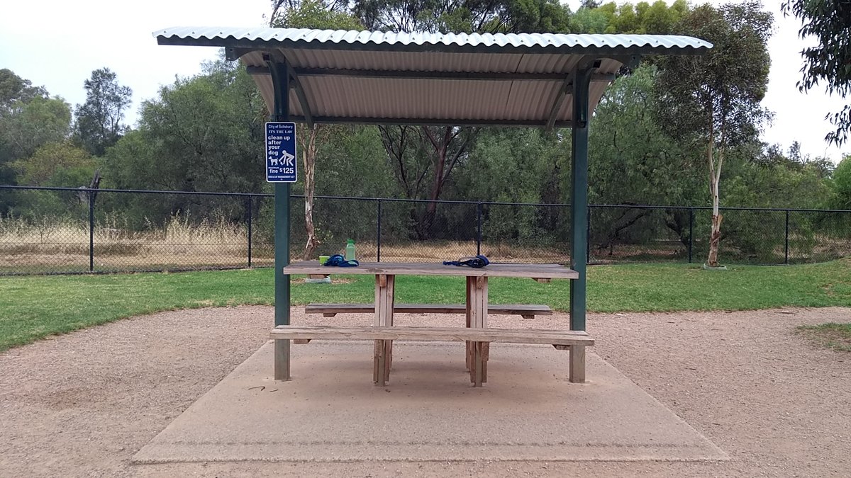Mawson Lakes Dog Park is a well-equipped, fully fenced off-leash facility situated within the picturesque Mawson Lakes recreational area in Australia. The park provides a spacious environment for dogs to exercise and socialize, featuring a mix of open grassy lawns and naturally shaded spots under large, mature trees. Key facilities include a variety of agility equipment such as a tunnel built into a mound and low hurdles, which offer mental and physical stimulation for pets. For the comfort of owners, the park is outfitted with benches and a large sheltered picnic table. Practical amenities are also present, including a dedicated dog water fountain, trash cans, and clear signage regarding park rules and waste disposal. The ground surface is a combination of grass, which shows some wear in high-use zones, and dirt or sand-based paths. The entire area is secured by a sturdy black chain-link fence with a double-gate entry system for added safety. The park's atmosphere is tranquil and community-focused, offering a pleasant outdoor space for both dogs and their owners to enjoy.