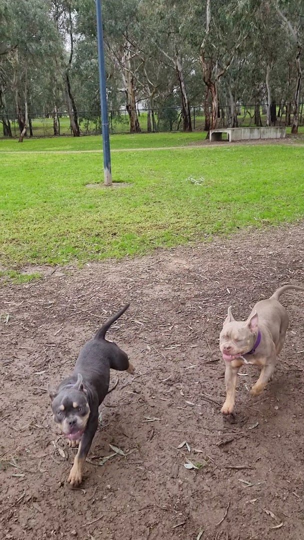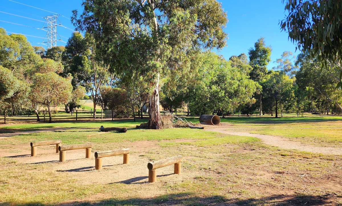 Happy Home Dog Park is a spacious and well-appointed off-leash facility located in a natural setting with many mature trees. The park is fully enclosed by chain-link fencing, ensuring a safe environment for dogs. The ground surface is a mix of lush green grass and dirt or mulch paths, providing varied textures for exploration. Shade is abundant throughout the park, provided by both large eucalyptus trees and man-made picnic shelters. For canine exercise and mental stimulation, the park features several pieces of agility equipment, including a concrete tunnel, wooden balance beams, and slalom poles. Human visitors can make use of the multiple picnic tables and benches scattered around the area. A dedicated water station with a tap and bowls is available to keep pets hydrated. The park also includes practical amenities like trash cans near the gated entrance and lighting for use during darker hours. Its overall atmosphere is peaceful and inviting, offering plenty of room for dogs to run and socialize.