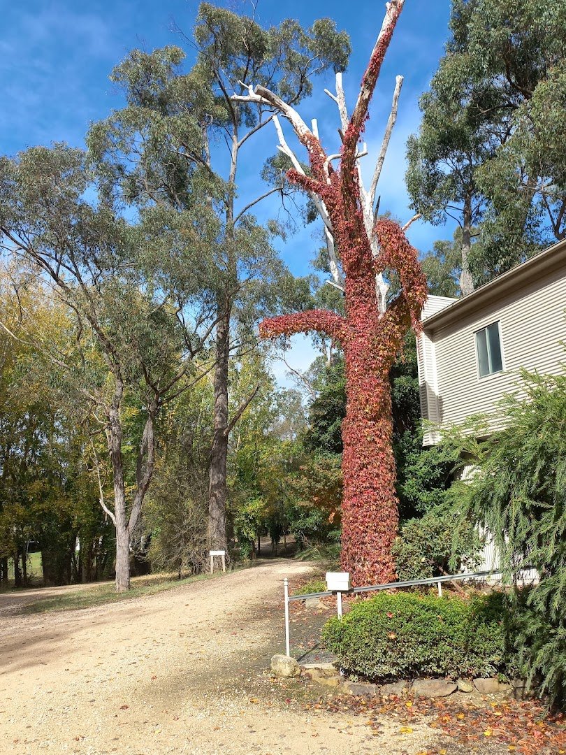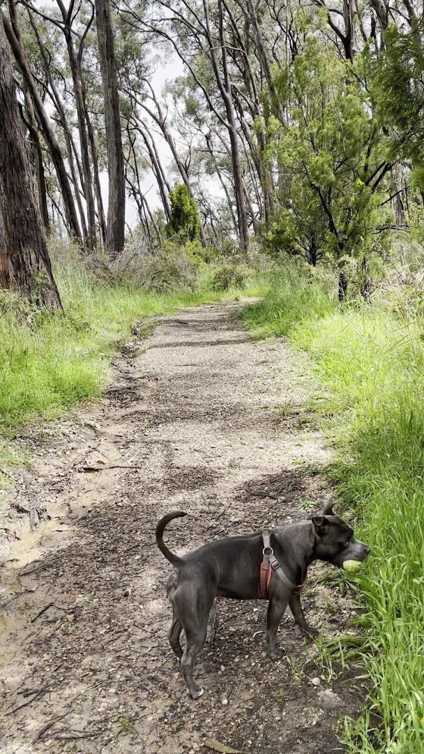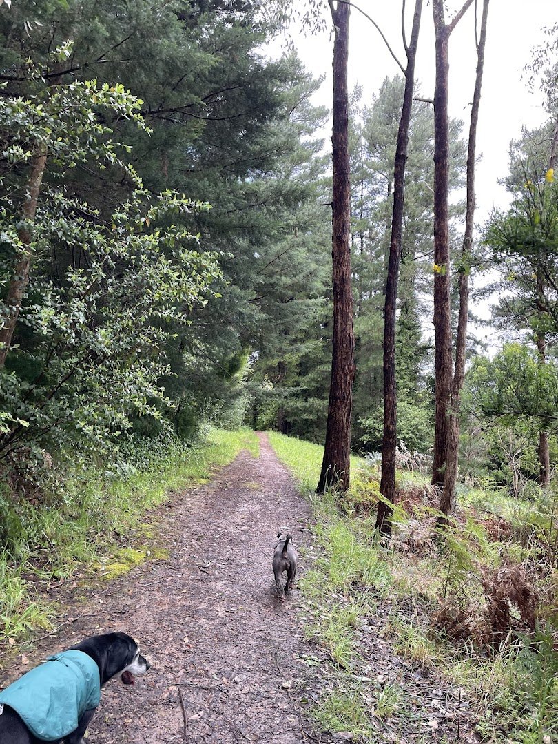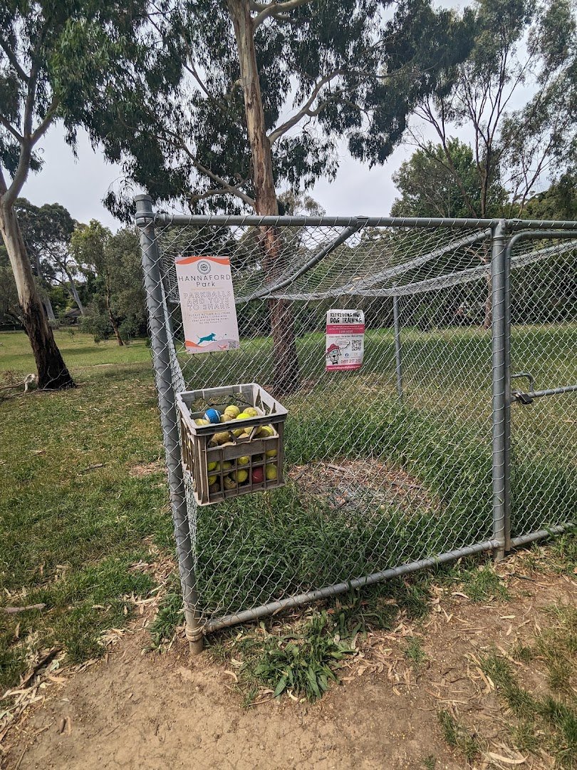 The Evelyn Halliday Reserve (and the adjacent Hannaford Park area) offers a diverse and expansive environment for dogs and their owners. The park features a variety of terrains, including wide-open grassy fields perfect for high-energy play and off-leash running, as well as shaded woodland trails with dirt and gravel surfaces for more adventurous walks. Mature eucalyptus and pine trees provide significant natural shade throughout the reserve. Facilities include a dedicated fenced-in area with a secure double-gate entry system to ensure safety. A unique community feature is a 'ball library' crate attached to the fence, encouraging toy sharing among visitors. For human comfort, the park is equipped with several benches, picnic tables, and a large covered picnic shelter, making it suitable for longer stays. The atmosphere is tranquil and natural, characterized by lush greenery, including ivy-covered trees and seasonal foliage. While the park provides ample space and basic amenities like seating and shade, specific facilities such as water stations or toilets are not immediately apparent in the provided views. The mix of manicured grass and rugged forest paths caters to different exercise needs.