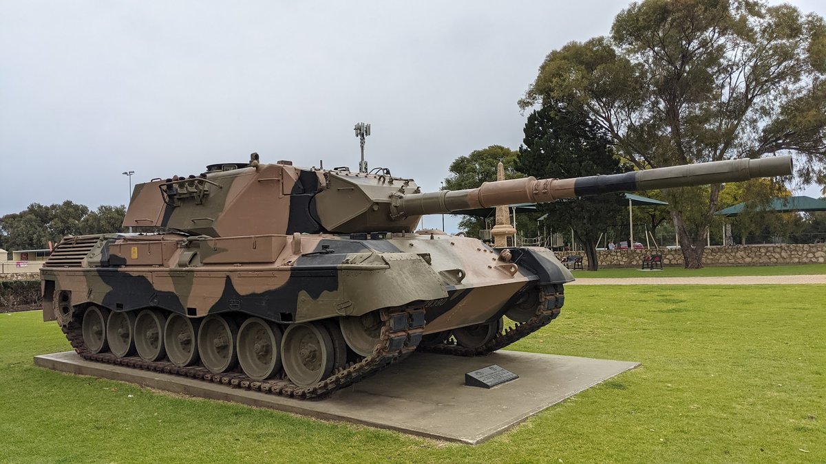 Two Wells Dog Park is a comprehensive community recreation space located in South Australia, offering a variety of amenities for both pets and their owners. The dedicated dog exercise area is fully enclosed with secure black metal fencing and features a well-maintained green grass surface, ideal for off-leash play. Within this fenced section, visitors can find agility equipment such as tunnels and ramps to keep dogs engaged. Beyond the dog-specific area, the park is expansive and features a unique historical display centered around a Leopard tank. For families, there are multiple modern playground areas, some protected by large shade sails and others featuring intricate wooden climbing structures over woodchip surfaces. The park's infrastructure is excellent, including paved walking paths, sheltered picnic tables, and public BBQ facilities. The landscape is a mix of open lawns, newly planted gardens, and a more naturalistic wooded section with mature eucalyptus trees and sculptures. This well-designed space provides a clean, safe, and versatile environment for the local community to enjoy outdoor activities with their canine companions.