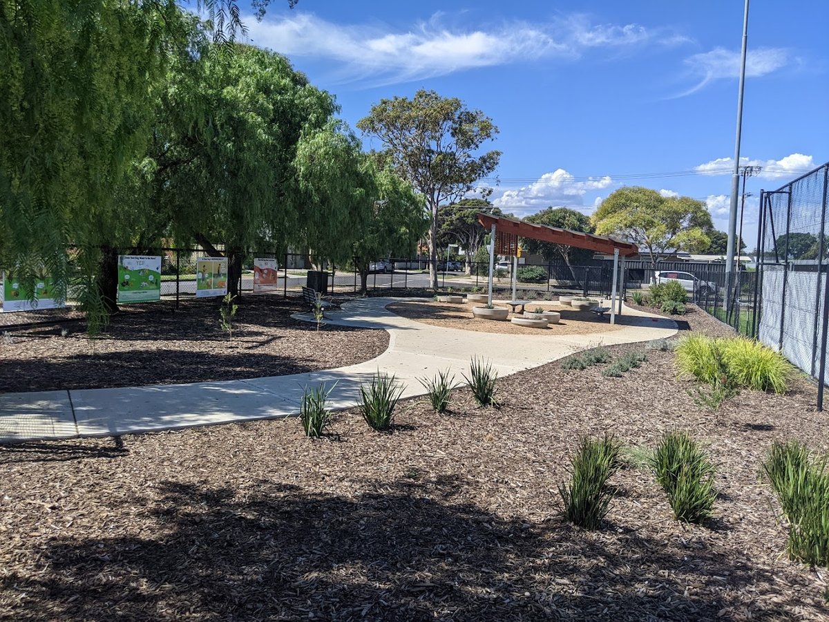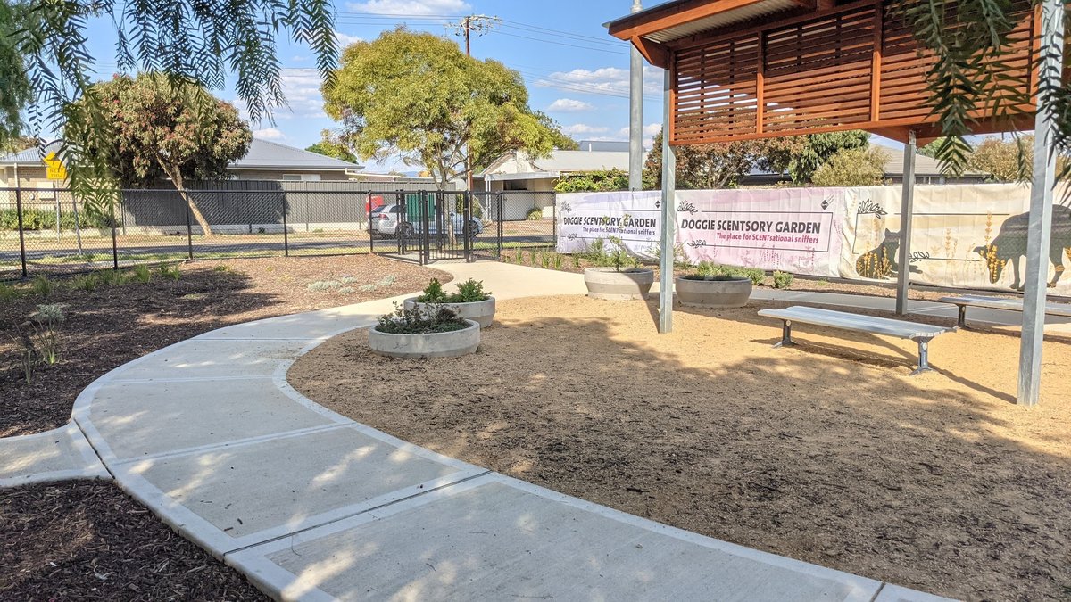 The Scentsory Garden - Dog Sensory Garden is a well-designed, multi-functional dog park located in Australia. It features a variety of ground surfaces, including lush green grass for running, wood mulch in shaded areas, sand around play equipment, and concrete or gravel paths for easy accessibility. The park is fully enclosed by high black chain-link fencing, ensuring a safe off-leash environment. A key highlight is the dedicated 'Scentsory Garden' section, which includes a wooden pavilion for shade, concrete planters with dog-friendly vegetation, and informational signage. For physical stimulation, the park offers unique agility and sensory equipment such as a tunnel mound, balance logs, and a sand pit. Mature eucalyptus and other trees provide ample natural shade throughout the space. Facilities include multiple benches for owners to rest, trash cans for waste disposal, and a double-gated entry system for security. The overall atmosphere is peaceful and engaging, catering to both a dog's physical exercise needs and their sensory exploration. The park's layout combines large open spaces for high-energy play with more structured, quiet zones for sniffing and discovery.