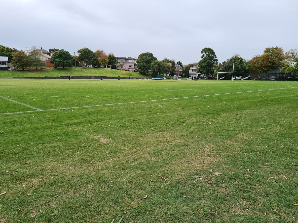 Armadale Reserve is an expansive and versatile public park located in a suburban setting, characterized by its vast, well-maintained grassy fields that serve as a popular off-leash area for local dog owners. The park's most prominent feature is a large sports oval, complete with goal posts, providing ample space for dogs to run and play. Mature, leafy trees are scattered throughout the reserve, offering significant natural shade and creating a pleasant, park-like atmosphere. For human visitors, the park provides several wooden benches situated along paved and gravel walking paths, as well as conveniently placed trash cans. While there is some low-level wire fencing along certain borders and garden beds, the park is not fully enclosed, requiring owners to have good voice control over their pets. The terrain is predominantly flat, making it accessible for various activities. Tall floodlights are present, suggesting the park remains usable into the evening. The surrounding area consists of residential buildings and quiet streets, where on-street parking is available. Overall, it offers a serene and open environment for both recreation and exercise.