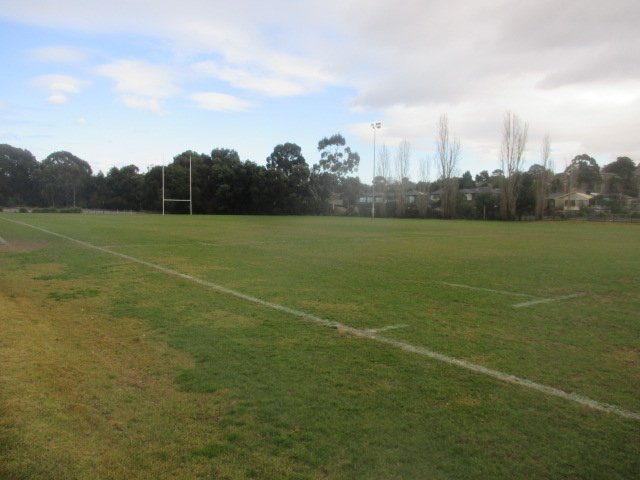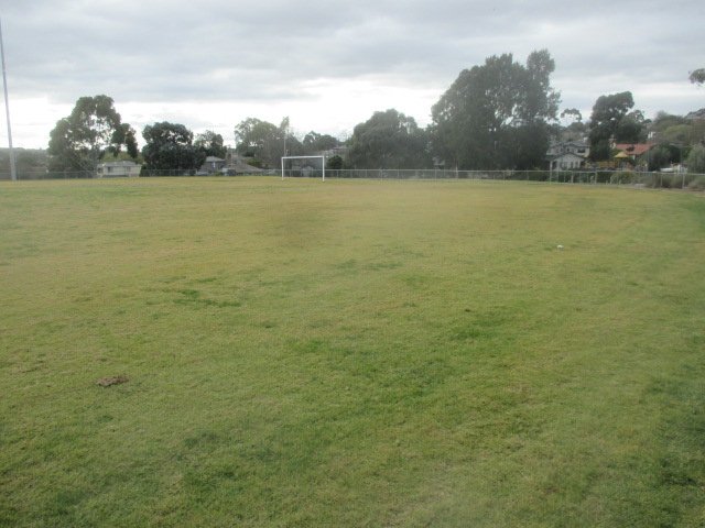 Ashwood Reserve Dog Off Leash Area is a spacious and versatile public park located in Australia, characterized by its expansive open grassy fields and mature eucalyptus trees. The park features large sports ovals, which provide a vast area for dogs to run and play off-leash when organized sporting events are not taking place. The terrain is predominantly flat with some gentle slopes, offering a variety of environments from wide-open spaces to more secluded, tree-lined sections. While the images show some perimeter chain-link fencing around the sports fields, the area does not appear to be a fully enclosed, dedicated dog park, suggesting a need for good recall. Facilities include trash cans for waste disposal and a substantial brick building that likely houses public toilets or clubrooms. Natural shade is abundant, provided by the numerous large trees scattered throughout the reserve, making it comfortable for visitors during warmer days. The overall atmosphere is peaceful and suburban, offering a mix of active play spaces and tranquil walking paths. No specific dog-related infrastructure like agility equipment or dedicated water stations is clearly visible in these views.