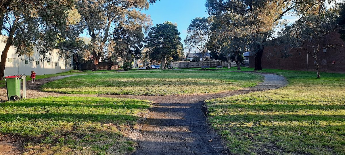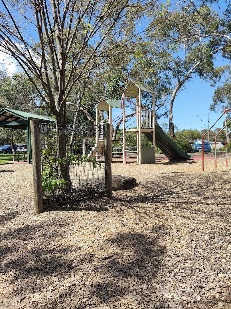 Canterbury Gardens Oval in Australia presents as a versatile and expansive community green space, well-suited for local residents and their pets. The park is characterized by its large, open grassy fields which provide ample room for running and play. Numerous mature trees, including large eucalyptus, are distributed across the landscape, offering significant natural shade for visitors. The ground surface is primarily well-maintained grass, with paved or dirt walking paths weaving through the area. While the images show a spacious environment, there is no visible evidence of a dedicated, fully fenced enclosure specifically for dogs, suggesting it may be an open-access park. On-site amenities include multiple trash bins for convenience, several park benches, and a sheltered picnic area equipped with tables. A well-equipped children's playground with slides and climbing frames is also a key feature, situated on a woodchip base. The park's topography includes some gentle slopes and is bordered by residential fencing and low wooden bollards near parking areas. The overall atmosphere is serene and suburban, making it a popular spot for family outings and dog walking in a natural setting.