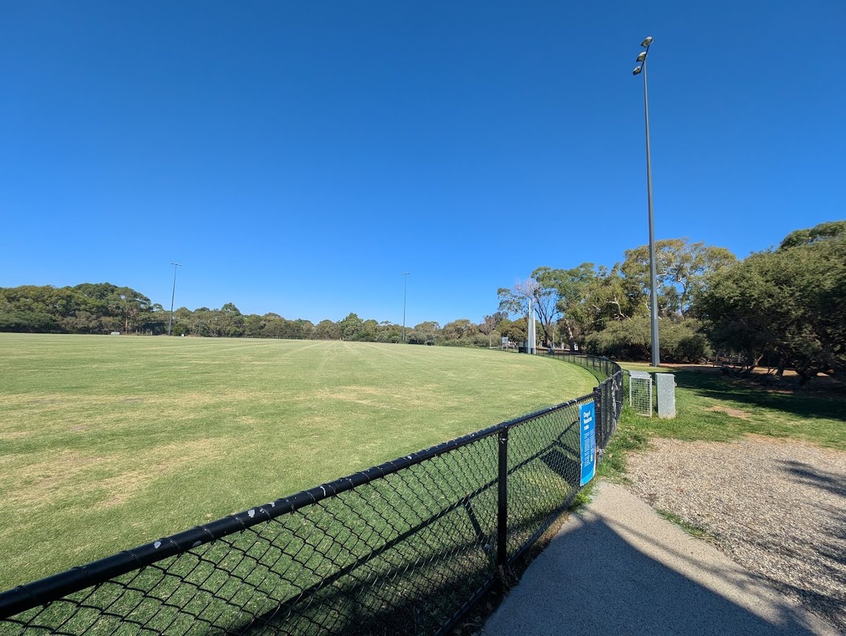 Donald MacDonald Reserve Dog Off Leash Area is a sprawling, well-maintained public space in Australia designed for canine exercise and socialization. The centerpiece of the park is a massive, fenced-in grassy oval, providing an expansive and secure environment for dogs to run freely. The ground surface is primarily grass, though some areas feature sand, dirt, or mulch around the base of mature trees. For human visitors, the park offers a sheltered picnic area equipped with tables and benches, offering shade and a place to rest. The presence of tall floodlights indicates the area is well-lit, potentially allowing for extended use during early morning or evening hours. A unique aspect of this location is its proximity to the water, as evidenced by dogs enjoying the nearby beach. The park's perimeter is defined by a sturdy black chain-link fence, and clear signage confirms its status as an off-leash zone. While it lacks specialized agility equipment, the sheer size and open layout make it an ideal spot for high-energy dogs to play and interact in a social atmosphere.