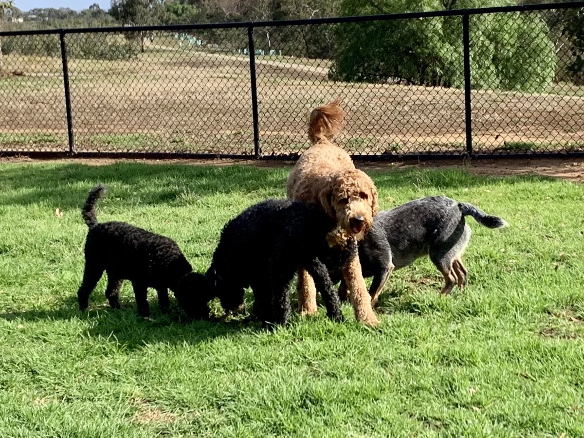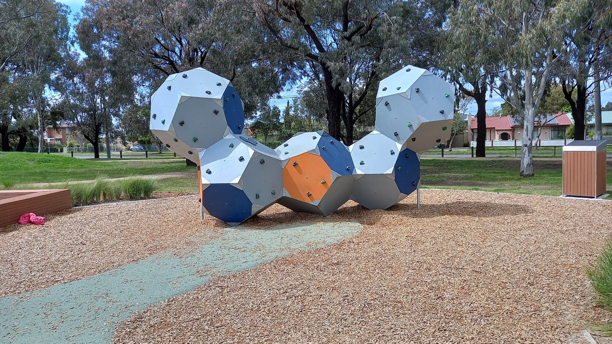 Ford Park Fenced Dog Park in Australia provides a versatile outdoor space for canine exercise and socialization. The park is characterized by its expansive, undulating green grassy fields that offer ample room for high-energy off-leash running. Complementing the open space is a dedicated fenced area featuring a more rugged terrain of dirt and mulch, equipped with naturalistic agility elements like a concrete tunnel and large boulders. Mature trees, including large eucalyptus specimens, are scattered throughout, providing essential natural shade. For human visitors, the park is well-appointed with multiple wooden benches and conveniently located trash cans. The perimeter is secured with sturdy black chain-link fencing, ensuring a safe environment. Adjacent to the dog-specific zones, the park includes modern recreational facilities such as a geometric climbing structure. The combination of well-maintained turf, natural obstacles, and essential amenities creates a welcoming and functional atmosphere for the local community and their pets.