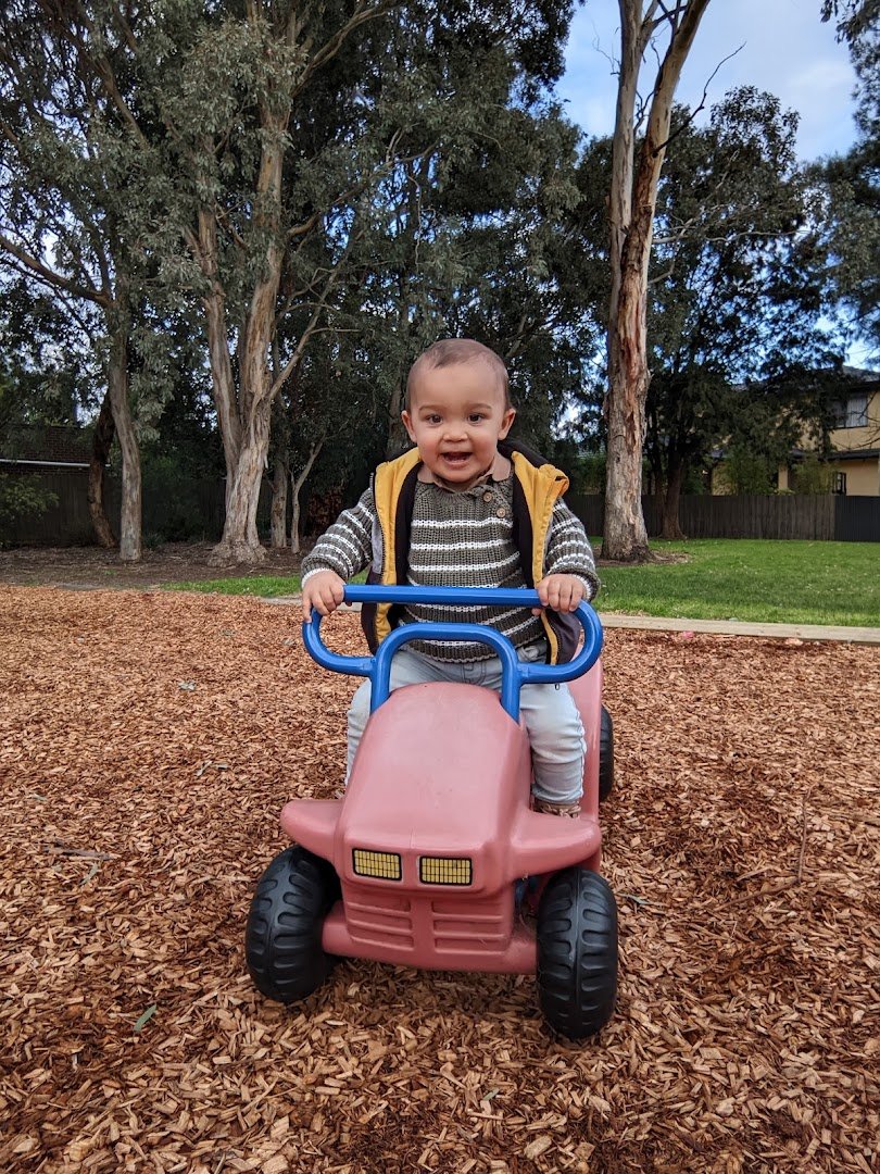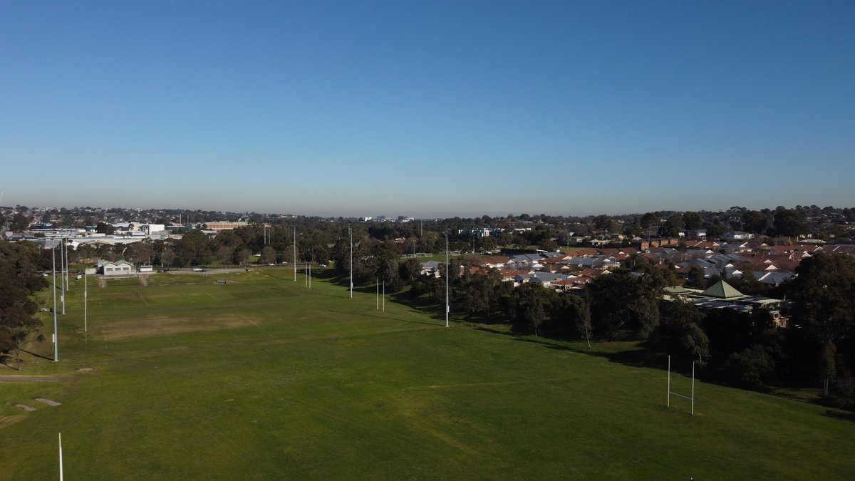 RHL Sparks Reserve Dog Off Leash Area in Australia offers a sprawling, multi-purpose recreational space characterized by its vast, open green fields. The primary ground surface is well-maintained grass, ideal for dogs to run and play. The reserve is notably large, featuring a sports field with goalposts and tall floodlights for evening use. While the area is designated for off-leash activity, there is no visible perimeter fencing in the images, suggesting an open-plan park layout. Natural shade is abundant, provided by a dense perimeter of mature eucalyptus trees and more wooded sections within the reserve. For families, there is a playground area with a woodchip surface, as seen with the child on the toy tractor. The overall atmosphere is serene and suburban, with the park bordered by residential streets and houses. Although specific dog facilities like water stations, waste bags, or agility equipment are not captured in these particular photos, the sheer size and grassy expanse make it a popular spot for local pet owners to exercise their dogs in a natural setting.