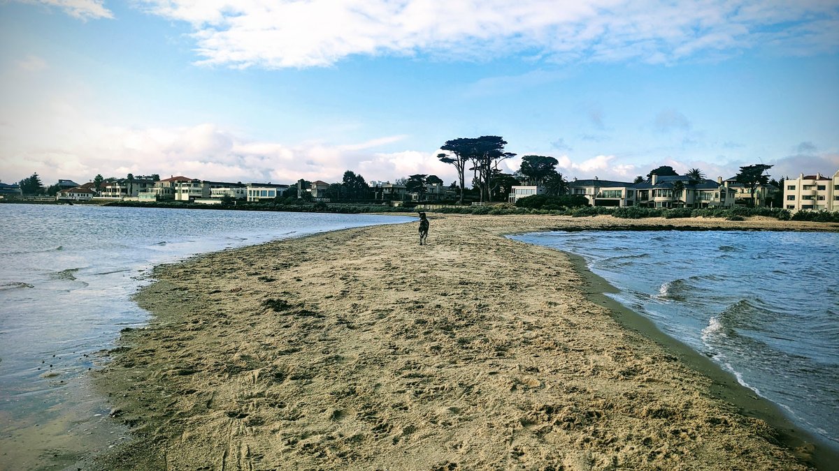 Brighton Sandown Street Dog Friendly Beach is an expansive coastal off-leash area located in Brighton, Australia. The park is characterized by its wide, sandy shoreline and unique sandbar features that allow dogs to explore and swim in the calm waters of Port Phillip Bay. The ground surface is primarily natural sand, occasionally mixed with shells and coastal debris, with low-lying dunes and scrubby vegetation providing a natural boundary. While there is no formal fencing, the area is naturally contained by the water and surrounding residential landscape. The atmosphere is serene and open, offering stunning views of the Melbourne city skyline and local sailing activity. Facilities are minimal on the beach itself; there are no visible water stations, toilets, or shaded structures in the immediate area, so visitors should come prepared. Access is provided via wooden walkways and small bridges that protect the sensitive dune environment. It is a popular spot for local dog owners seeking a large, natural space for their pets to run freely and socialize in a picturesque seaside setting.