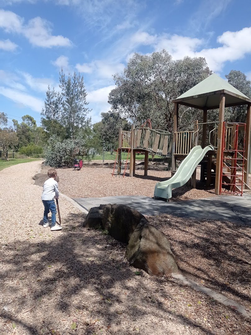 Jones Park Dog Off Leash Area offers a sprawling and versatile outdoor space for both pets and their owners. The park is characterized by its vast, undulating grassy fields that provide ample room for dogs to run and play freely. Mature eucalyptus trees are scattered throughout the landscape, offering significant natural shade, complemented by a man-made picnic shelter. For families, the park includes a well-equipped playground with slides and climbing structures, set upon a safe wood-chip surface. Practical amenities are well-integrated, including a dual-level water fountain suitable for both humans and dogs, conveniently located trash cans, and sturdy metal benches for resting. The terrain features a mix of flat areas and gentle slopes, with well-maintained gravel paths crisscrossing the space for easy navigation. While the park is bordered by some perimeter fencing near residential boundaries, it maintains an open, airy atmosphere. The presence of overhead power lines and views of a nearby ornate church with golden domes add unique visual elements to this community-focused recreational area.