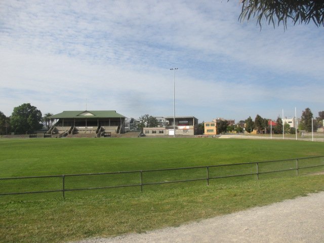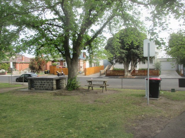 Wylie Reserve Dog Off Leash Area is a spacious, multi-use recreational park characterized by its expansive, well-maintained grassy fields. The park offers a mix of flat open spaces, suitable for sports and running, and sloped areas bordered by mature trees and residential fencing. Facilities include wooden picnic tables situated under the shade of large trees, public trash cans, and benches for seating. A notable feature is the presence of a sports oval with a grandstand and stadium lighting, suggesting the area serves various community functions. The perimeter is partially defined by chain-link fencing, particularly along street boundaries and around the sports field. While the park provides ample room for dogs to roam off-leash, there are no dedicated fenced enclosures or separate areas for different dog sizes visible in the images. The atmosphere is peaceful and suburban, with a blend of natural shade and open sunlight. The surface is predominantly natural grass, complemented by gravel and paved walking paths, making it a versatile spot for exercise.