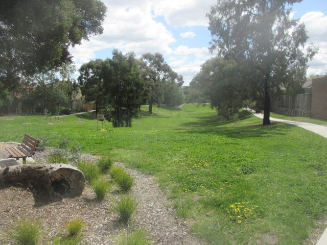 Morang Reserve Dog Off Leash Area is a spacious, multi-use public park located in a suburban setting. The reserve features expansive, undulating grassy fields that provide ample room for dogs to run and play. The landscape is characterized by a mix of open spaces and areas densely populated with mature trees, offering significant natural shade throughout the day. Facilities visible within the park include a basketball half-court, a wooden bench for resting, and paved walking paths that meander through the greenery. A small section of a playground with woodchip surfacing is also present. The park has a gentle slope, creating a valley-like feel in certain sections. While it is designated as an off-leash area, there is no evidence of perimeter fencing in the images, suggesting it is an open-access reserve. Solar-powered lighting is installed along the paths, enhancing safety during twilight hours. The overall atmosphere is peaceful and natural, making it a versatile spot for both pet owners and local residents. The ground surface is primarily well-maintained grass, with some mulched areas around specific amenities.
