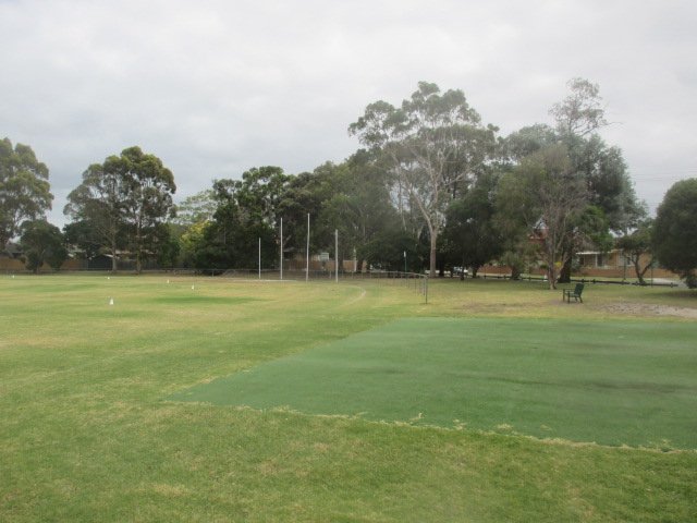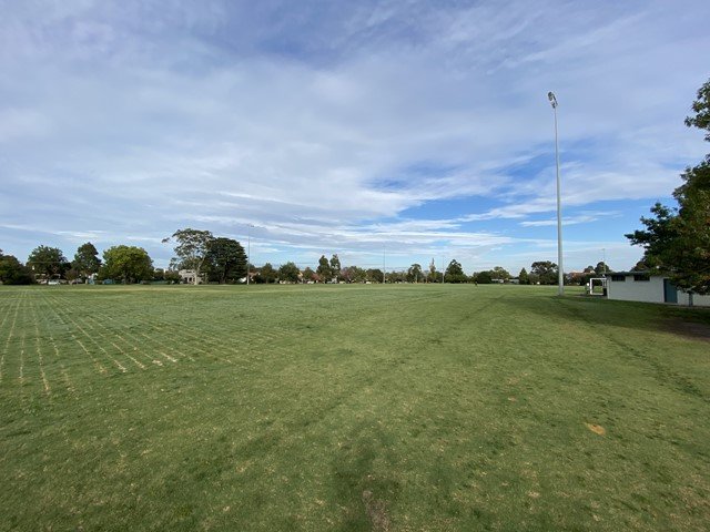 Lord Reserve Dog Off Leash Area in Australia is a vast, multi-use recreational space primarily consisting of expansive, well-manicured grass fields. The park's size is a standout feature, providing a massive open area for dogs to exercise and socialize. Large, mature trees are strategically located around the edges and in specific clusters, offering ample natural shade for both pets and their owners. The ground surface is predominantly natural grass, though some sections appear to have artificial turf, likely for sports purposes. While the area is designated for off-leash activity, it is not a fully enclosed dog park; instead, it features partial low-profile fencing along some boundaries, maintaining an open connection to the surrounding residential neighborhood. On-site facilities include multiple benches for seating, some placed on concrete pads under the shade of trees. A small utility building is visible, which typically serves as a public toilet or changing room for the adjacent sports fields. Tall floodlights are present, suggesting the area is well-lit for evening use. The atmosphere is open, airy, and tranquil, making it an ideal spot for community recreation.