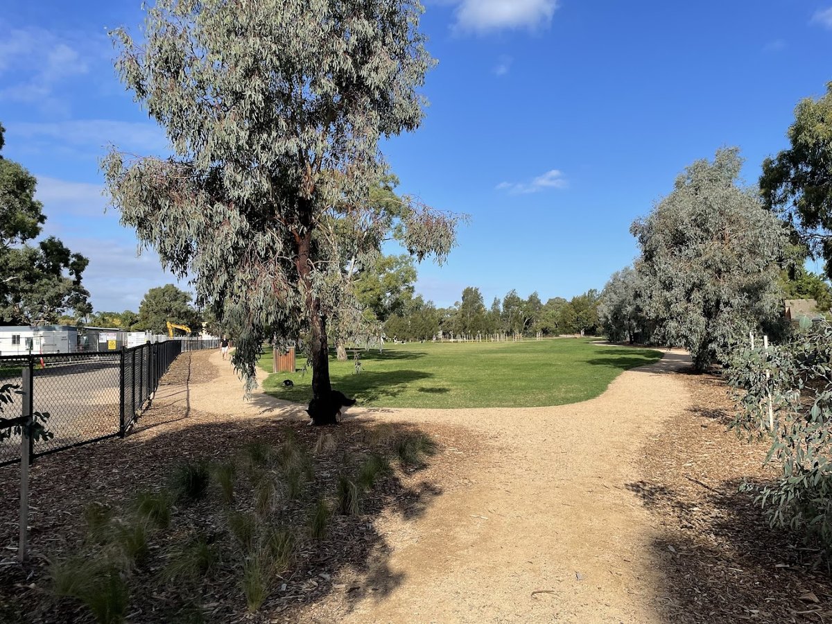 Roy Dore Reserve Fenced Dog Park in Australia is a spacious, well-maintained off-leash area designed for canine exercise and socialization. The park's primary feature is a large, flat grassy field, ideal for running and active play. A perimeter path made of dirt and gravel provides a walking route for owners. The entire dog-specific area is enclosed by secure chain-link fencing. Natural shade is provided by several mature eucalyptus trees scattered within and around the enclosure. Adjacent to the dog park, the reserve offers additional family-friendly amenities, including a children's playground with wooden climbing structures and slides set on a woodchip surface. A brick building located nearby likely houses public toilet facilities. The park's proximity to a beach and its open, airy feel contribute to a pleasant community atmosphere. While specific dog-related amenities like water stations or waste bags aren't explicitly shown in these views, the overall infrastructure supports a high-quality recreational experience for pets and their owners.