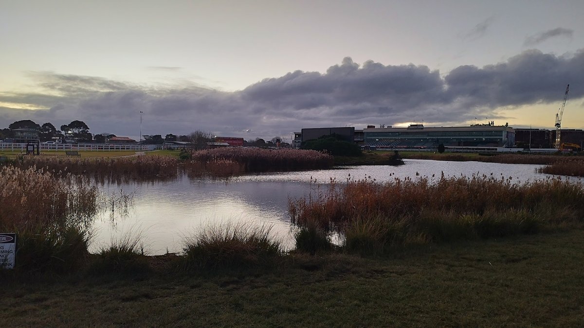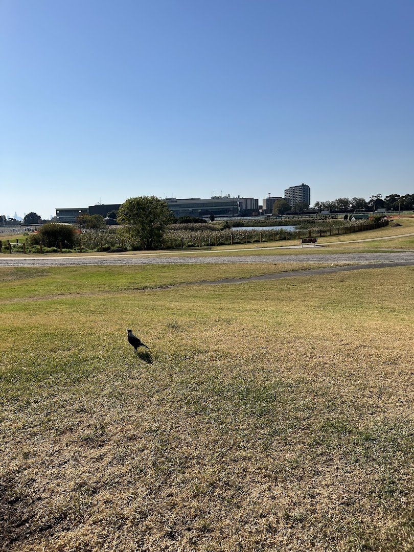 Caulfield Racecourse Reserve Off-Leash Dog Park offers a vast and diverse environment for dogs and their owners. The park features a massive open grassy area, perfect for long-distance fetching and high-energy running. A highlight of the facility is the dedicated, fully fenced dog agility area, which contains various obstacles such as an A-frame, weave poles, and logs, set upon a well-maintained sand or fine gravel surface. This specific zone is surrounded by mature trees that provide ample natural shade and includes benches for owners to rest. Beyond the active play areas, the reserve encompasses a scenic wetland with a large pond and reeds, adding a tranquil atmosphere to the park. The entire area is designated as a leash-free zone, as indicated by clear signage at the entrance. The perimeter is secured with chain-link fencing, ensuring a safe environment. While the main fields are primarily flat grass, there are slight undulations in the terrain. The park's location within the racecourse reserve provides a unique backdrop of grandstands and urban skylines, making it a spacious and well-equipped destination for local pet owners.