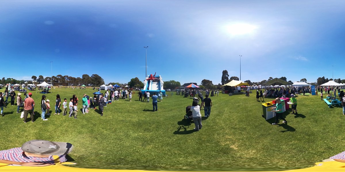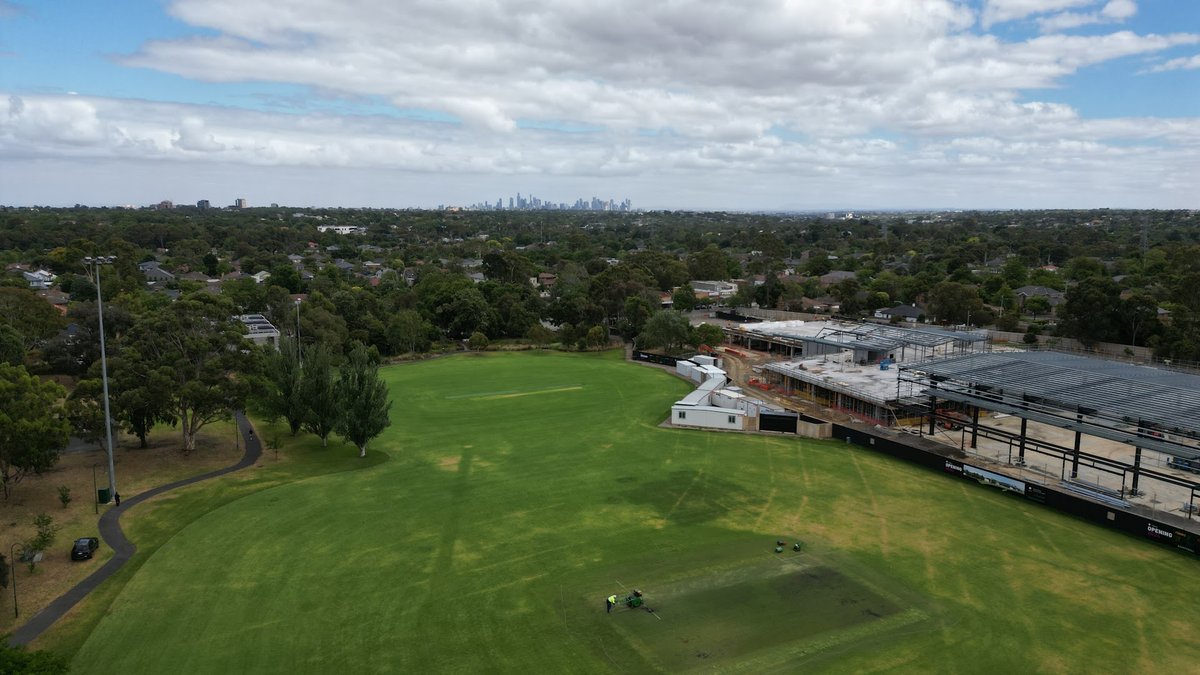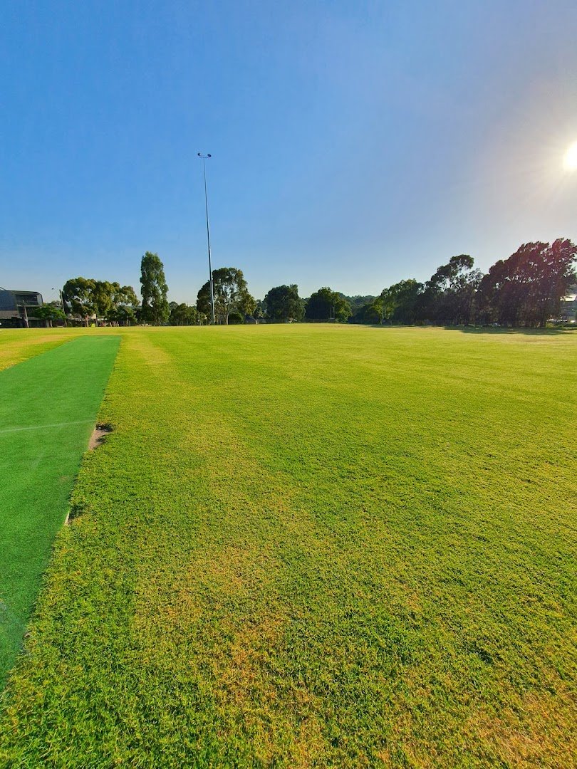 Batesford Reserve Dog Off Leash Area is a sprawling, multi-purpose recreational space located in Australia, characterized by its vast, well-maintained grassy fields. The area serves as a significant community hub, often hosting local events and sports such as cricket and soccer, as evidenced by the presence of synthetic pitches and goalposts. For dog owners, the reserve offers a generous off-leash environment where pets can run freely across the expansive lawns. The park is equipped with essential amenities, including a modern water refill station with a dog bowl, several wooden benches for resting, and conveniently placed trash cans. Mature trees scattered throughout the perimeter provide patches of natural shade, while tall floodlights suggest the area is used during evening hours. The reserve is partially enclosed by a mix of wooden and chain-link fencing, separating it from adjacent residential properties. A brick pavilion building likely houses public toilets and changing rooms. The overall atmosphere is open and welcoming, providing ample space for both active play and leisurely walks along the paved pathways that wind through the greenery.