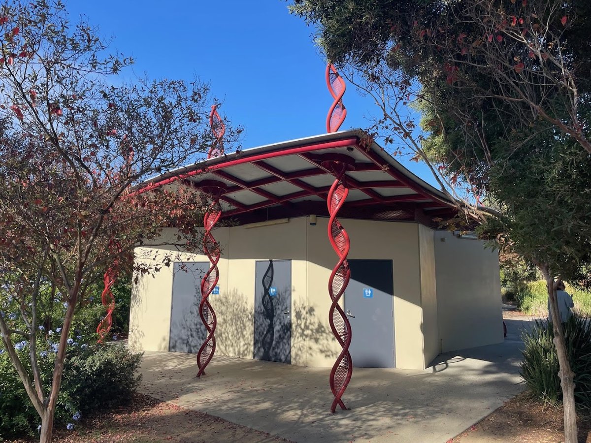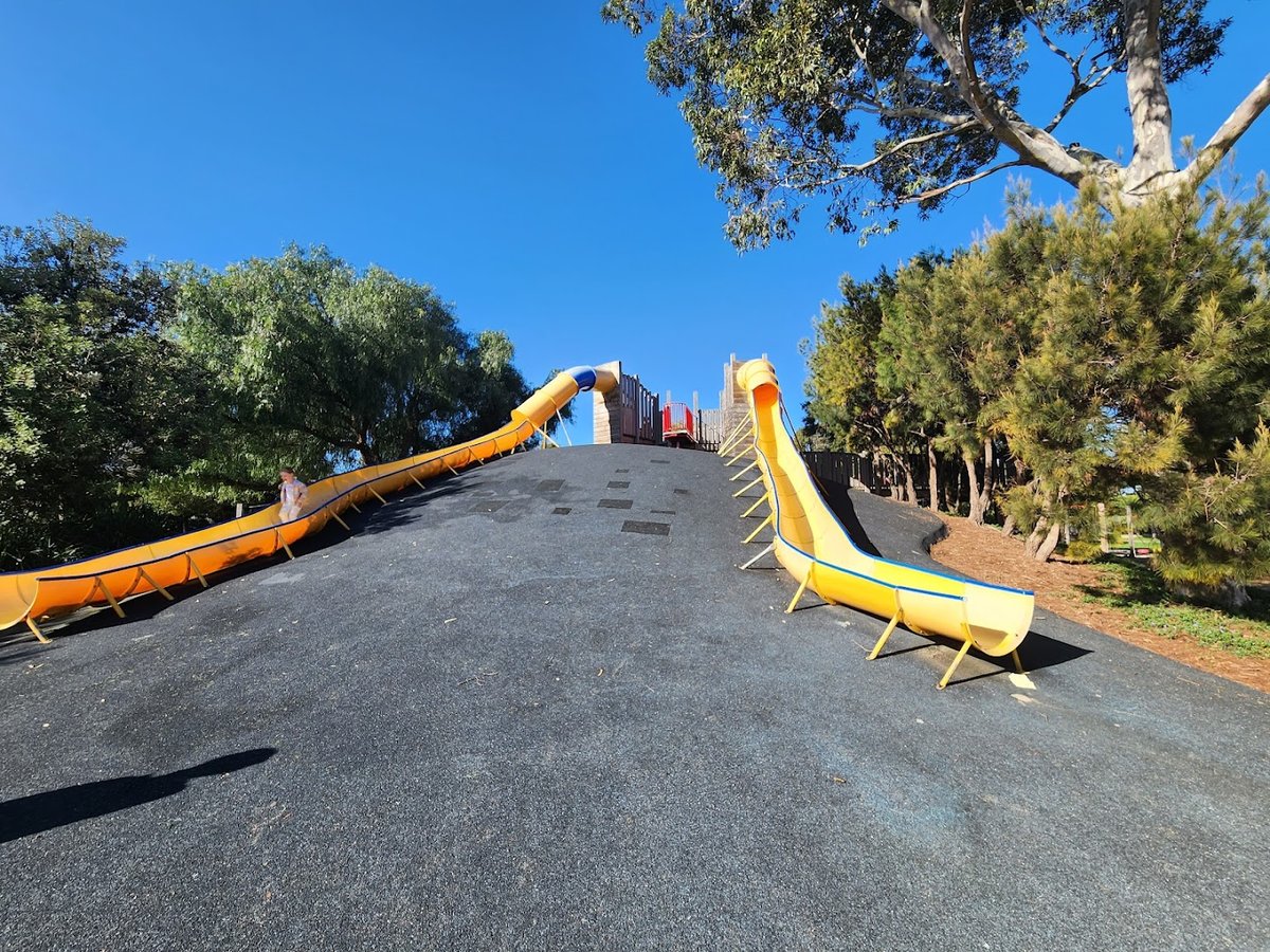 Chelsea Bicentennial Park Dog Off Leash Area is a large, multi-functional recreational space in Australia. It features a massive open grassy field specifically designated for off-leash exercise, allowing dogs plenty of room to roam. For those seeking a more contained environment, there is a fenced-in dog area that includes a dedicated water fountain with integrated dog bowls. The park also boasts a specialized agility section with a wood-chip surface, equipped with hurdles and a tunnel. Beyond dog-specific facilities, the park is family-friendly, offering a substantial playground with long slides and a rubberized safety surface. Visitors can enjoy well-maintained amenities such as a modern toilet block with unique artistic pillars, multiple sheltered picnic areas, and electric BBQ stations. The park's versatility is highlighted by its ability to host large community events like carnivals. The landscape is primarily flat with some gentle slopes, featuring a mix of open grass, shaded areas under trees, and paved walking paths, creating a welcoming atmosphere for all visitors.