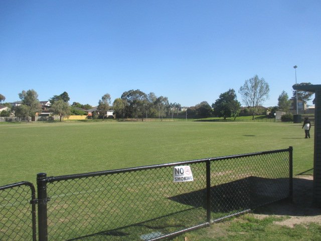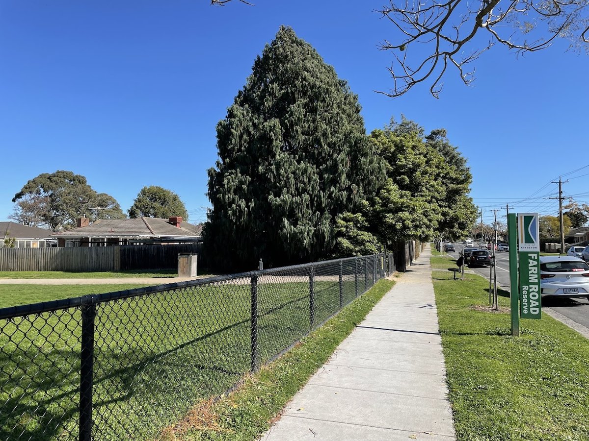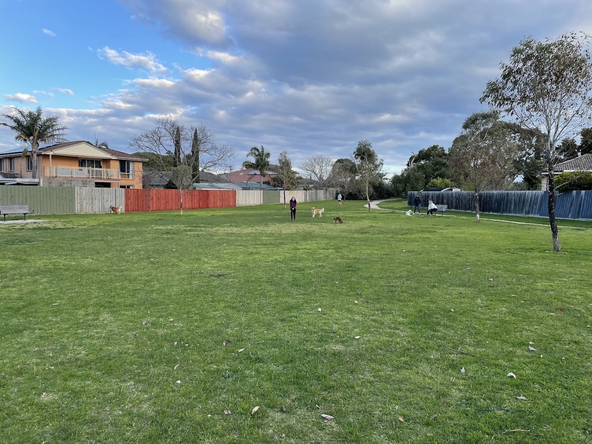 Farm Road Reserve Fenced Dog Park in Australia offers a spacious and well-maintained environment for dogs to exercise off-leash. The park features a vast, flat grassy field that provides ample room for large dogs to run and play fetch. The perimeter is secured by a combination of sturdy black chain-link fencing and tall wooden residential fences, ensuring a safe and enclosed space. Mature trees are scattered throughout the area, offering significant natural shade for both pets and their owners on sunny days. For human visitors, several park benches are strategically placed around the field, allowing for comfortable supervision. A concrete walking path borders or intersects the area, making it accessible. The atmosphere is open and suburban, bordered by residential properties and a quiet street where parking is available. While the park lacks specialized agility equipment or water stations in the immediate view, its primary draw is the sheer size of the open green space, which is ideal for social interaction and high-energy activities.