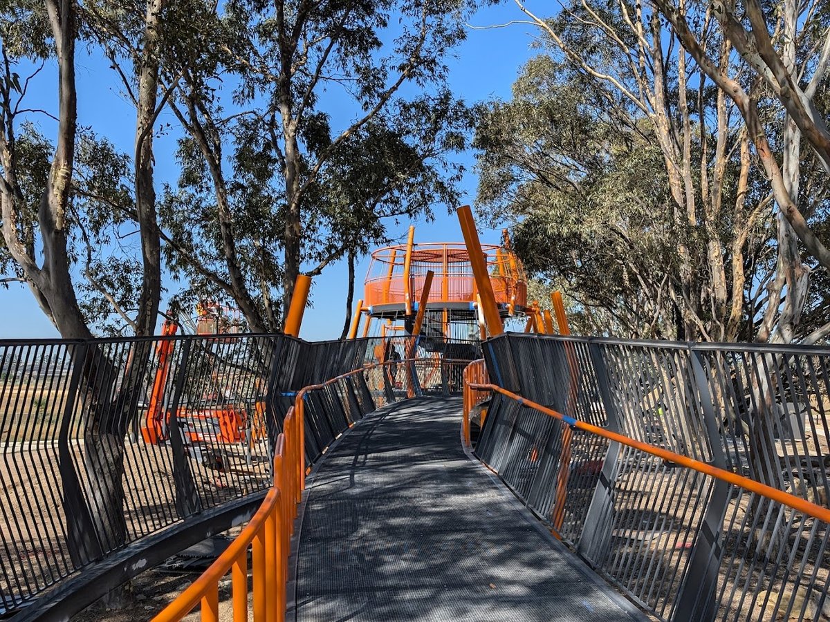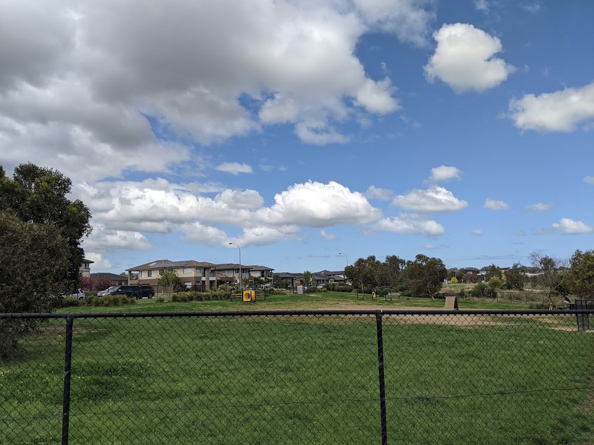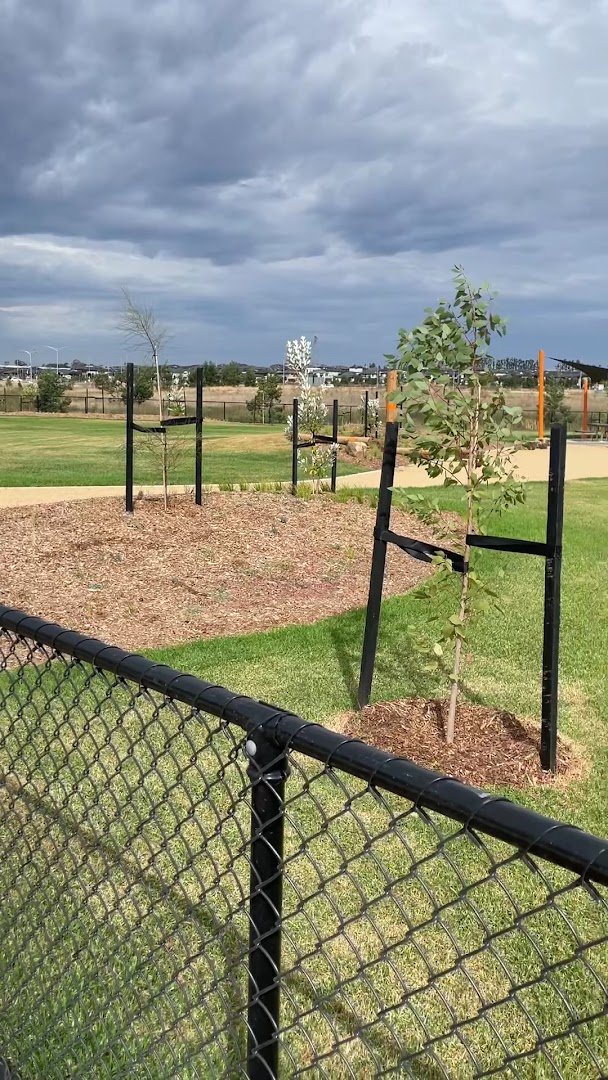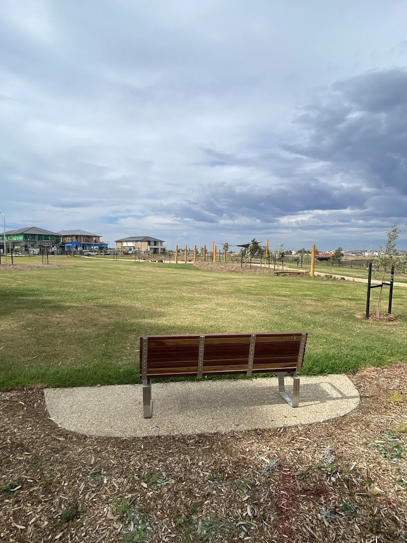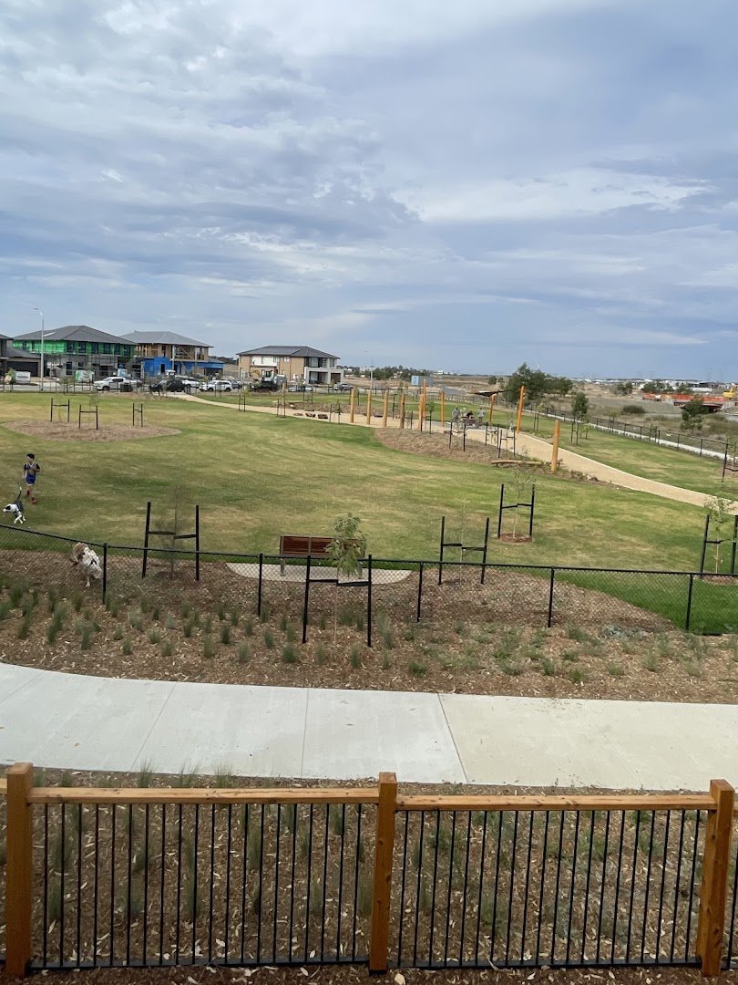 Tree Walk Park Fenced Dog Park, located in the City of Casey, Victoria, is a contemporary recreational space designed for canine exercise and social interaction. The facility features a generously sized, fully fenced off-leash area. The primary ground surface is a mix of well-kept grass and compacted dirt or gravel in high-use zones. A standout feature is the variety of agility equipment provided, including a tunnel, an A-frame ramp, and wooden platforms, which cater to active dogs. For human visitors, the park offers several sturdy wooden benches positioned on concrete pads, providing comfortable vantage points. While young trees have been planted within the enclosure to provide future shade, the area is currently quite open. The park's most distinctive feature is the adjacent 'Tree Walk,' an elevated architectural walkway that winds through mature eucalyptus trees, offering a unique experience outside the dog-specific zone. The entire area is enclosed by a secure black chain-link fence, ensuring a safe environment within the developing residential neighborhood.