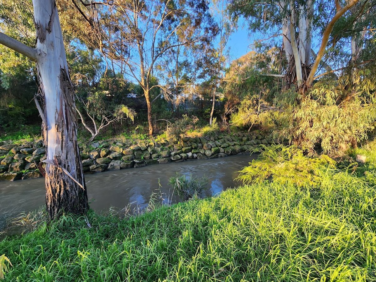 Bowden Reserve Dog Off Leash Area is a sprawling, naturalistic park located in Australia, offering a serene environment for dogs and their owners. The park is characterized by its vast open grassy fields, which provide ample space for running and play. Mature eucalyptus trees are scattered throughout the reserve, offering significant natural shade and a rustic bushland atmosphere. The terrain is diverse, featuring flat meadows, gentle slopes with mulch, and established dirt walking paths. A prominent feature of the reserve is the adjacent river or creek with rocky banks, providing a scenic element and a place for dogs to cool off. While the park is an off-leash area, it features partial fencing, including both wooden and chain-link sections along certain boundaries. Facilities are sparse, maintaining the area's natural feel, though at least one park bench is available for seating. The presence of high-voltage power lines in the distance and the open water access suggest that while the area is spacious, owners should remain attentive. Overall, it is a picturesque, large-scale green space ideal for long walks and energetic exercise in a tranquil setting.