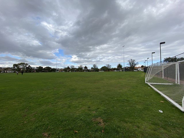 McDonald Reserve Dog Off Leash Area is a spacious and versatile public park located in Australia, featuring expansive open grass fields that are ideal for dogs to run and play freely. The park serves as a multi-use recreational space, including sports facilities like soccer goals and tall light poles for evening use. The landscape is characterized by a mix of well-maintained lawns and natural areas with mature eucalyptus and deciduous trees that provide significant shade for visitors. The terrain is mostly flat with some gentle slopes, and while the primary surface is grass, there are also dirt and gravel paths for walking. On-site facilities include several park benches for seating and a dual-purpose water fountain designed for both humans and dogs. While chain-link fencing is visible along certain boundaries, the area appears to be a large, open-access reserve rather than a fully enclosed, dedicated dog run. The overall atmosphere is peaceful and community-focused, offering a pleasant environment for pet owners to exercise their dogs in a scenic, green setting.