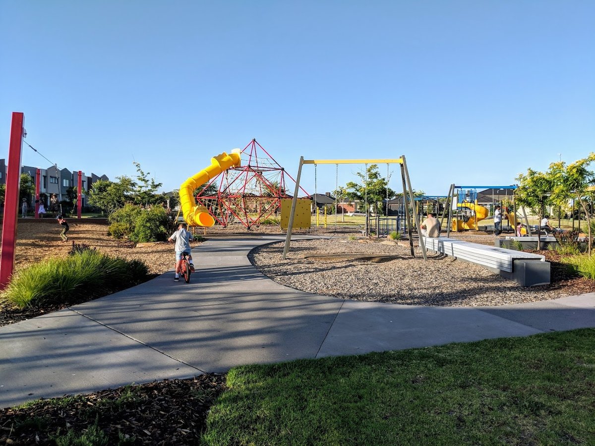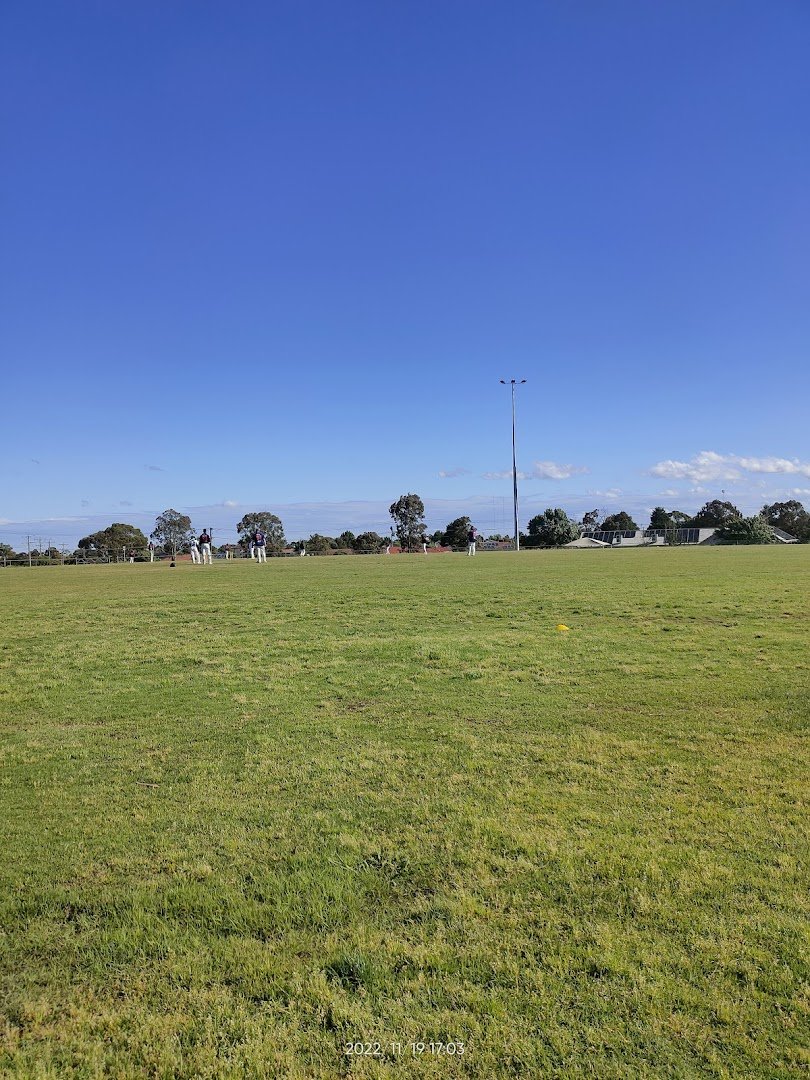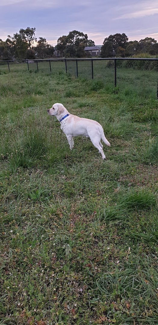 Hothlyn Drive Reserve offers a comprehensive outdoor space featuring a dedicated, fully fenced off-leash dog area. This specific zone is secured with black chain-link fencing and a double-gate entry system to ensure pet safety. The interior of the dog park provides a varied terrain for sensory stimulation, including well-kept grass, sections of wood mulch, and a central gravel pit adorned with large rocks and fallen logs that serve as natural agility equipment. Beyond the fenced dog area, the reserve includes a vast open grassy field suitable for sports like cricket, as evidenced by the presence of players and tall stadium-style lighting. Adjacent to the dog park is a modern, well-equipped playground featuring colorful slides, a rope climbing pyramid, and swings, connected by paved walking paths. While the park is expansive and open, there is a lack of significant overhead shade within the dog enclosure, though some perimeter plantings are visible. Seating is provided via long, contemporary concrete and wood benches near the play areas. The park's location within a residential neighborhood makes it a convenient and popular community hub for families and dog owners alike.