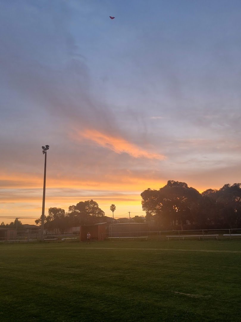 Vic Foster Reserve Dog Off Leash Area offers a diverse environment for dogs and their owners. The park features a large, open grassy field, ideal for high-energy activities and long-distance fetching, as seen in the expansive views during sunset. Complementing the open space is a more structured, landscaped section characterized by wood chip surfacing, large natural rocks, and a prominent fallen log that serves as a natural obstacle or seating element. This area is well-shaded by several mature eucalyptus trees, providing a cool retreat from the sun. A well-maintained gravel path winds through the reserve, accompanied by a sturdy wooden-slat park bench for owners to rest. The perimeter is partially secured with black metal fencing, separating the park from adjacent residential properties. Tall floodlights are present, suggesting the area may be usable during early evening hours. The overall atmosphere is peaceful and suburban, blending functional open space with naturalistic landscaping elements to create a versatile outdoor space for the local community.