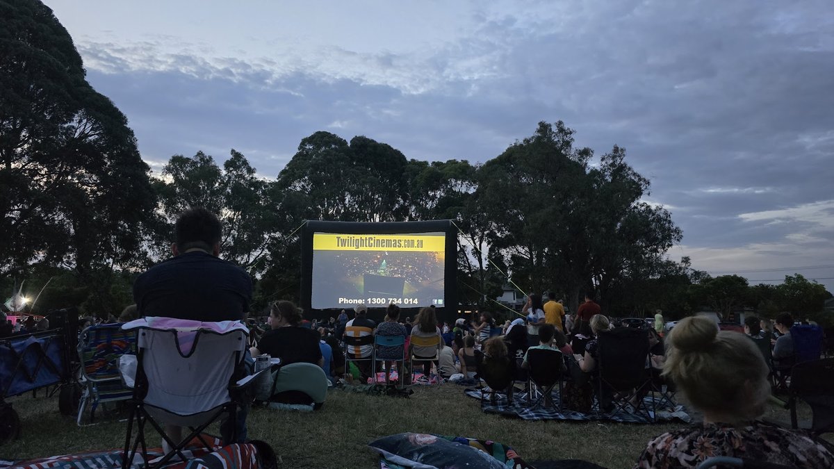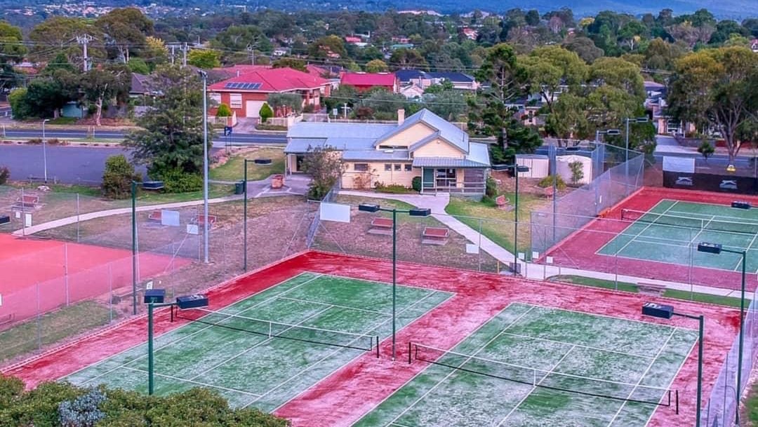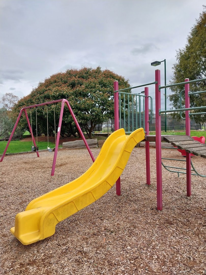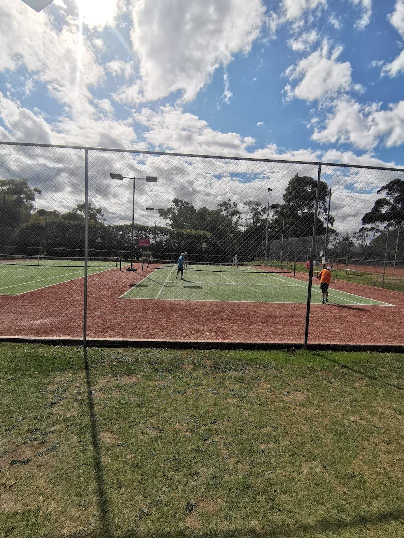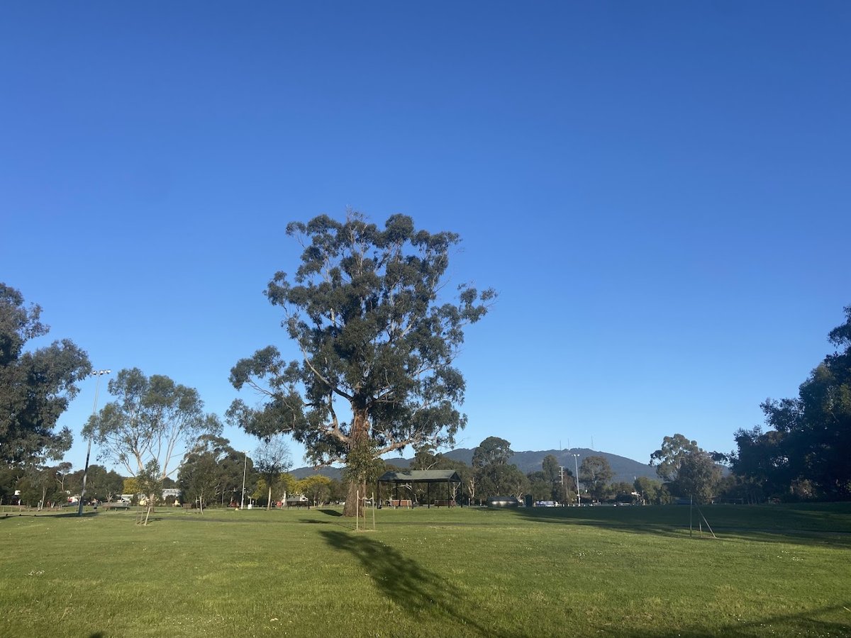 Charles Allen Reserve is a versatile and expansive community park located in Australia, featuring a dedicated off-leash dog area. The park is characterized by its vast, well-maintained grassy fields, providing ample space for dogs to run and play freely. Beyond the dog-friendly zones, the reserve is equipped with various recreational facilities, including multiple fenced tennis courts with professional lighting and a children's playground featuring a slide, swings, and climbing structures on a woodchip base. For visitors' comfort, the park offers a sheltered picnic area with tables and several benches scattered throughout the grounds. Mature eucalyptus trees provide significant natural shade, enhancing the park's pleasant atmosphere. The reserve also serves as a hub for community gatherings, such as outdoor movie nights, as evidenced by the large inflatable screen setup. While the tennis courts are securely fenced with chain-link, the main reserve area is largely open, bordered by residential streets and some perimeter fencing. Practical amenities like a parking lot and trash cans are visible near the central clubhouse building, making it a convenient destination for local pet owners and families alike.