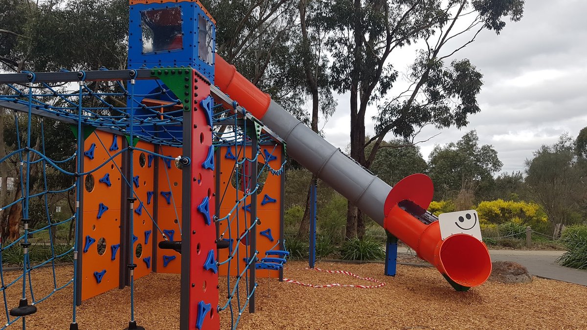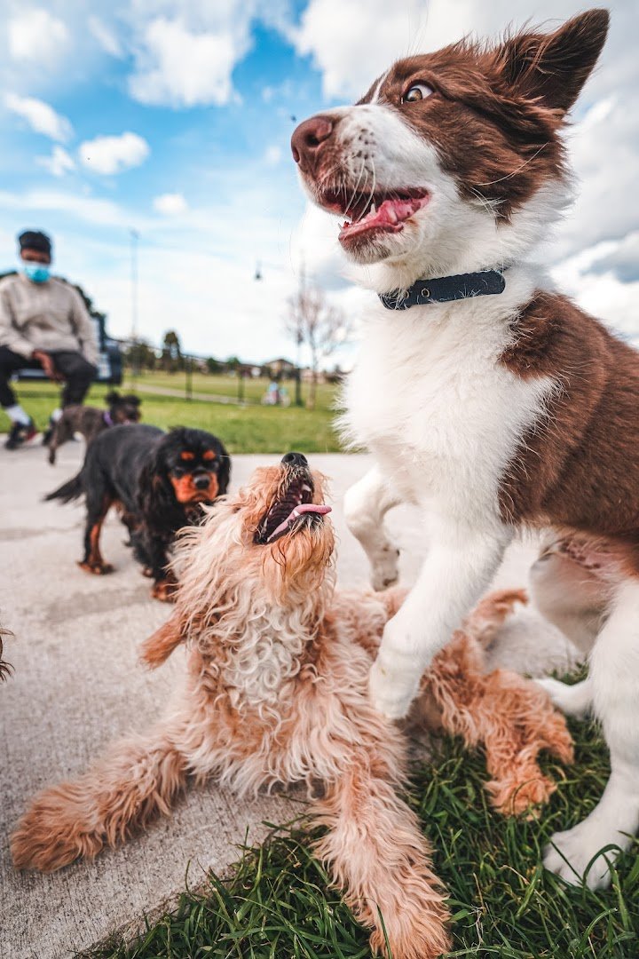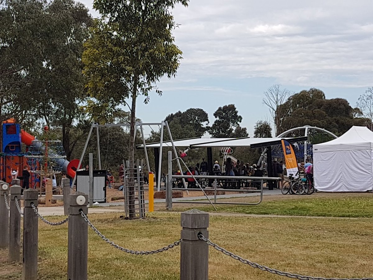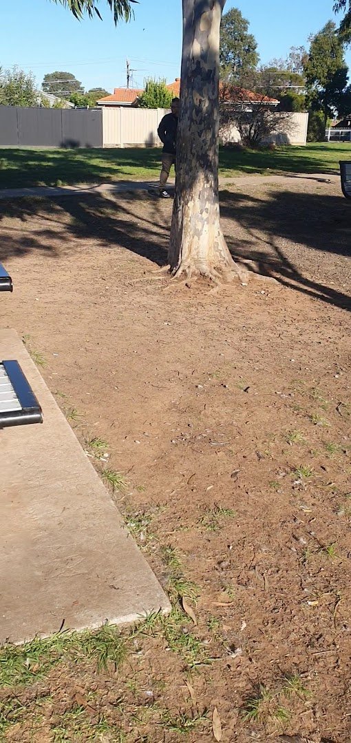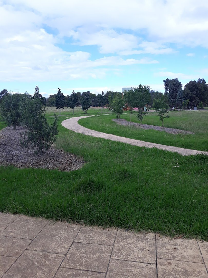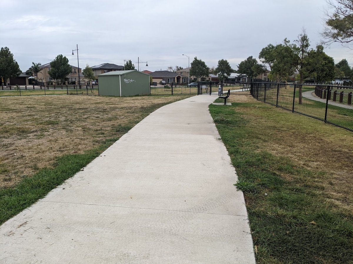 Davitt Drive Reserve Fenced Dog Park in Australia offers a spacious and well-equipped outdoor environment for both dogs and their owners. The park features a large, fully fenced off-leash area, primarily surfaced with a mix of lush green grass and some dirt patches in high-traffic zones. A network of concrete paths winds through the reserve, making it accessible for walking and providing a clean surface for movement. For human visitors, the park includes several benches and a large covered picnic area with tables, providing ample shade and a place to rest. The reserve is particularly family-friendly, as it boasts a modern playground with climbing structures, swings, and a slide, as well as a basketball hoop and soccer goals in the adjacent open fields. Mature eucalyptus trees are scattered throughout, offering natural shade, while tall light poles suggest the area is equipped for evening use. The atmosphere is active and communal, with plenty of room for dogs to run and play. The perimeter is secured by black chain-link fencing, ensuring a safe environment for off-leash exercise.