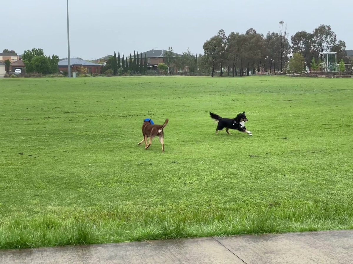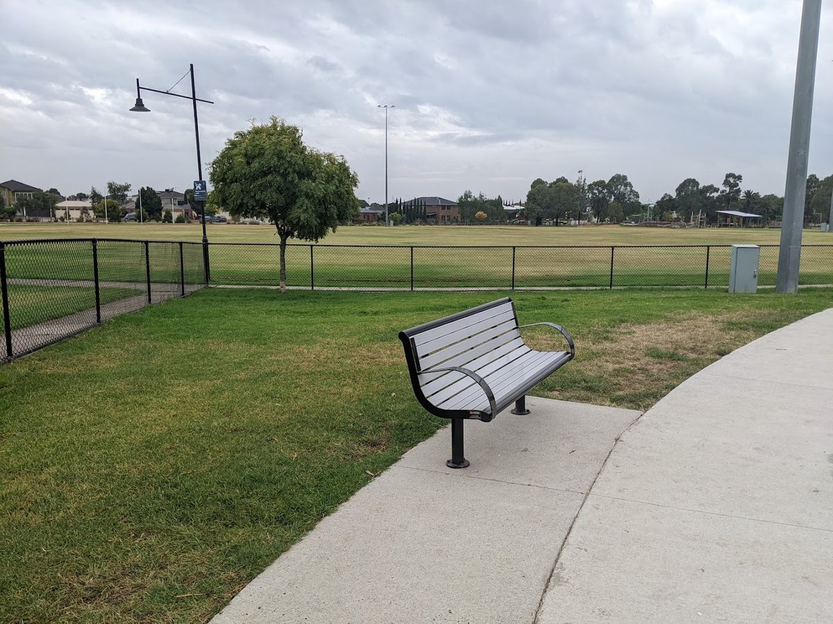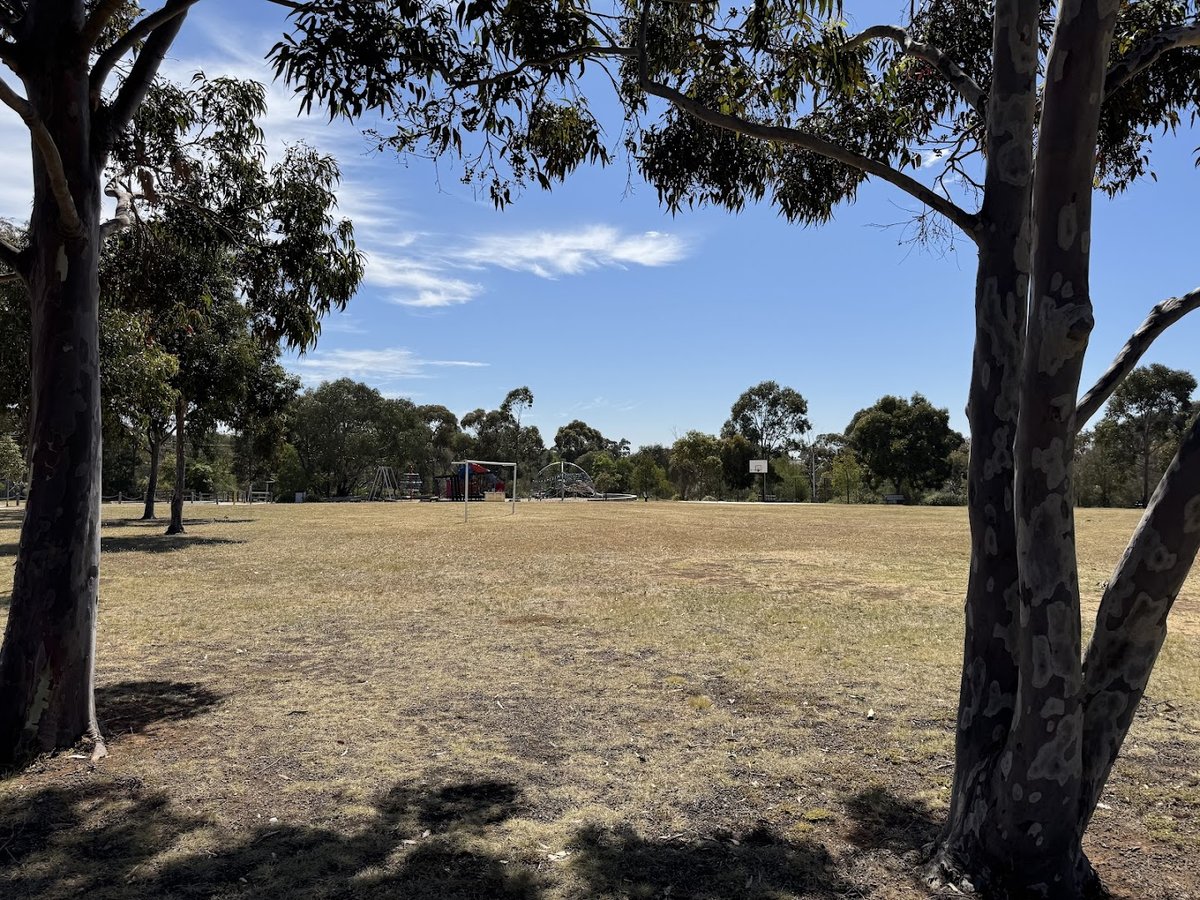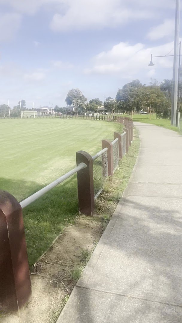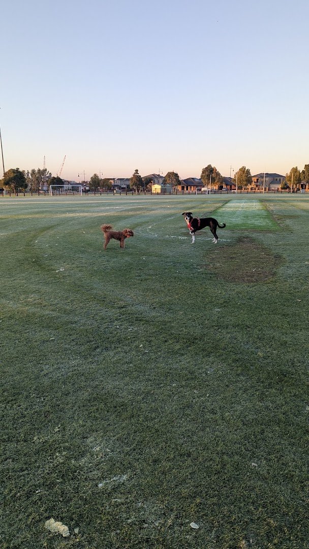 Balmoral Park Fenced Dog Park offers a spacious and versatile environment for canine exercise in a suburban setting. The facility features a dedicated fenced-off area constructed with secure black chain-link fencing, ensuring a safe space for dogs to play off-leash. Inside and adjacent to this area, visitors will find well-maintained concrete walking paths and several modern metal benches for rest. Beyond the specific dog enclosure, the park expands into vast open grassy fields that serve as multi-purpose sports ovals, featuring soccer goals and cricket pitches, where dogs are also seen running freely. The ground surface is predominantly natural grass, ranging from vibrant green to drier patches. While the interior of the dog park is mostly open, mature eucalyptus and other trees lining the perimeter provide pockets of natural shade. Tall floodlights are positioned around the fields, indicating the park is accessible during low-light hours. The broader park area also includes a children's playground and basketball facilities, making it a community hub. The overall atmosphere is peaceful and open, bordered by residential neighborhoods, providing plenty of room for high-energy dogs to roam and socialize.