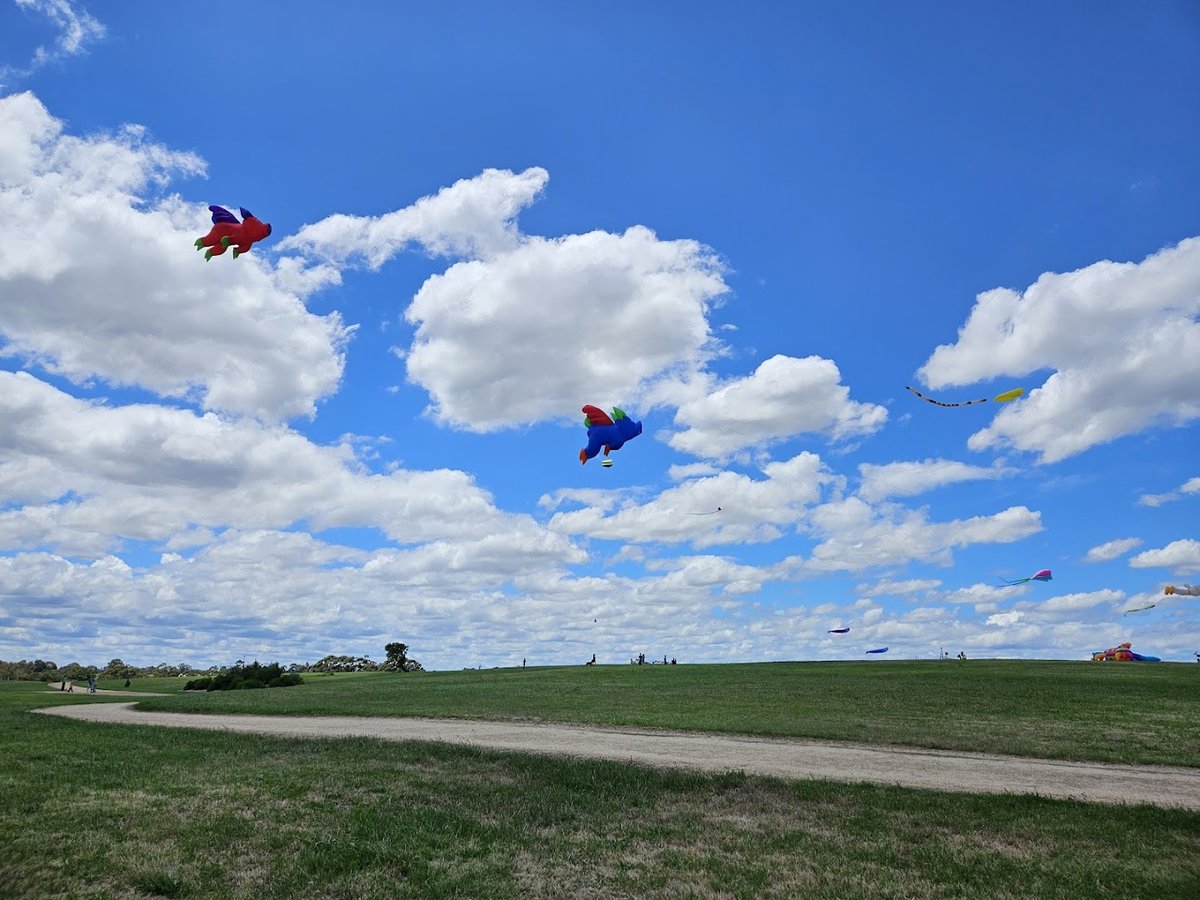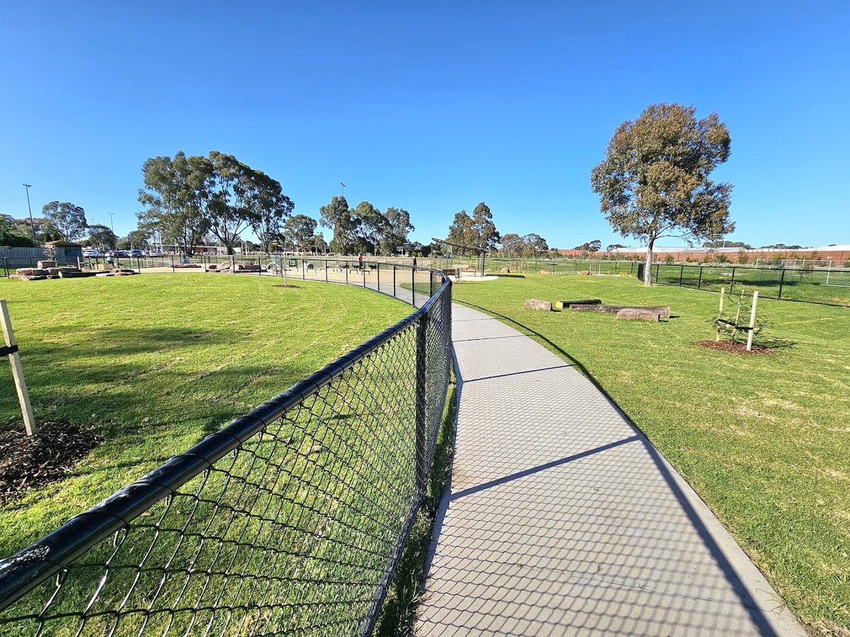 Spring Road Reserve Off-leash Dog Park in Australia offers a vast, multi-functional space for dogs and their owners. The park features a well-maintained fenced area with a smooth concrete perimeter path and lush green grass, ideal for secure off-leash play. Beyond the fenced enclosure, the reserve expands into massive, open grassy fields with dirt tracks, perfect for long-distance running, kite flying, and exploring. The landscape is primarily flat with some gentle slopes and is dotted with both young and established trees providing patches of shade. While the images don't explicitly show water stations or restrooms, the sheer size of the park is a standout feature. Unique enrichment elements, such as a dog-friendly ball pit, suggest a community-focused environment. The park is bordered by a mix of industrial buildings and natural vegetation, creating a wide-open atmosphere with plenty of room for high-energy activities. The variety of surfaces, from manicured lawns to more rugged fields, caters to different exercise needs.