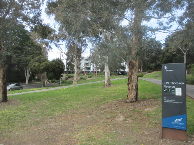 J.W. Thomson Reserve is a spacious, multi-purpose public park located in Doncaster, Australia, featuring a popular designated dog off-leash area. The park is characterized by its expansive, undulating green lawns and a significant canopy of mature eucalyptus and deciduous trees, which provide ample natural shade throughout the day. The ground surface is primarily well-maintained grass, intersected by a network of paved walking paths that are frequently used by both dog walkers and local residents. While the reserve is bordered by residential properties and some perimeter fencing is visible at these boundaries, the dog off-leash area itself is an open-plan, unfenced space rather than a dedicated enclosed run. Facilities within the broader reserve include a modern playground, a basketball half-court, and several benches for seating. The atmosphere is peaceful and suburban, offering a large, natural environment for dogs to exercise and socialize freely. The presence of a small parking area nearby and clear directional signage makes it easily accessible for visitors, serving as a vital green space for the local community.
