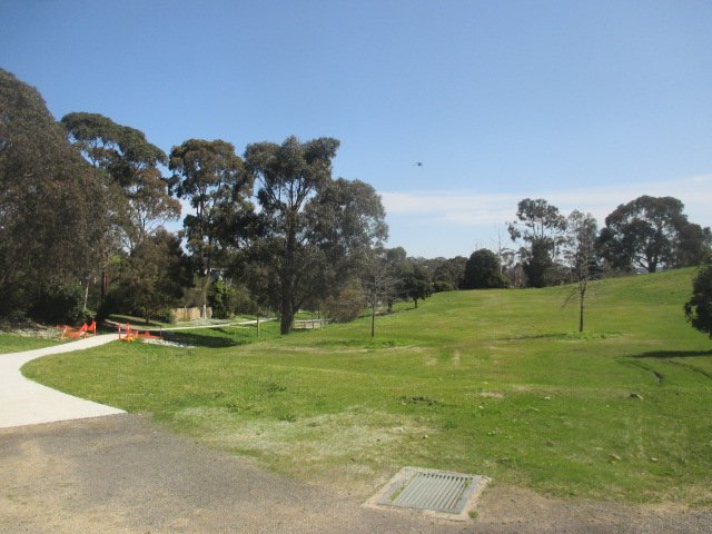 Lawford Reserve Dog Off Leash Area is an expansive and versatile public park situated within a residential neighborhood in Australia. The reserve is characterized by its vast, undulating green spaces, featuring both wide flat plains and significant grassy slopes that provide a dynamic environment for dogs to exercise. The primary ground surface is well-maintained natural grass, which is ideal for running and play. While the park serves as an off-leash area, it is not a fully enclosed facility; instead, it features partial fencing consisting of residential boundaries and some chain-link sections near sports infrastructure. The park is well-integrated with other community amenities, including a modern, colorful playground and a dedicated concrete skate park with various ramps and ledges. Numerous mature trees are scattered across the landscape, providing ample natural shade for both pets and their owners. Paved walking paths meander through the reserve, connecting different sections and making it accessible for strollers and wheelchairs. Benches and picnic tables are available near the activity hubs, contributing to a welcoming and family-friendly atmosphere.