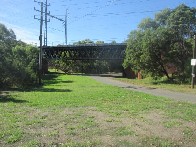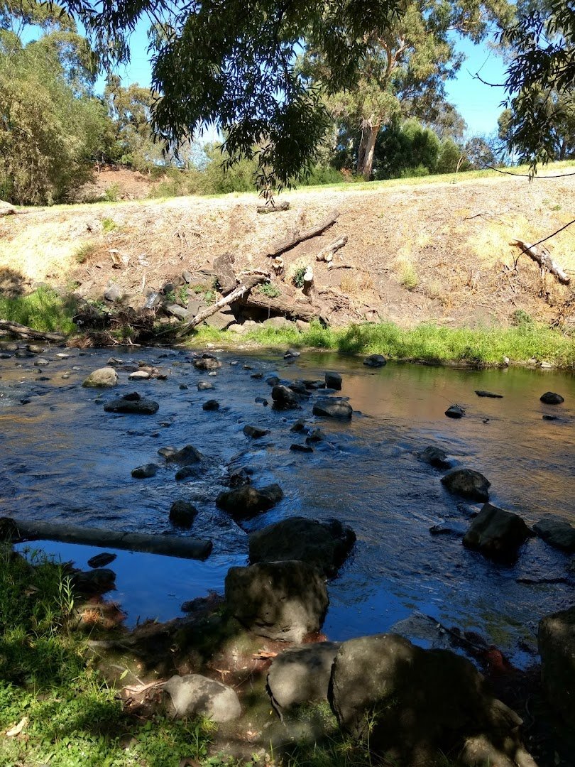 Rushall Reserve Dog Off Leash Area is a spacious and naturalistic park located along a scenic waterway. The park features a large, open grassy field that provides ample room for dogs to run and play off-leash. The terrain is notably varied, consisting of flat grassy sections, dirt patches, and rugged rocky slopes that lead down to the water's edge, offering dogs a chance to explore natural textures or take a dip. Mature eucalyptus trees and dense native shrubbery provide significant natural shade across much of the reserve. A paved shared-use path traverses the area, and a large railway bridge is a prominent landmark in the background. While wooden fencing is visible along the perimeter of adjacent residential properties, the park itself maintains an open, unfenced feel that blends into the surrounding environment. The atmosphere is peaceful and wild, emphasizing a nature-focused outing. No specific amenities like benches, trash cans, or agility equipment are visible in these views, highlighting the reserve's character as a preserved natural corridor rather than a highly developed urban dog park.
