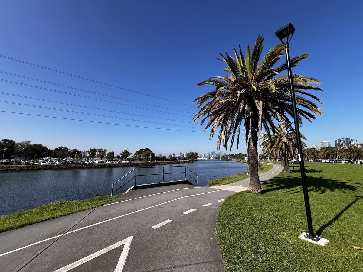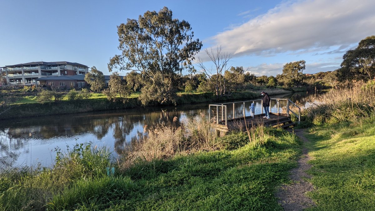 Footscray Park Dog Off Leash Area is a spacious, scenic riverside park located along the Maribyrnong River. The park features expansive open grassy fields interspersed with mature trees, providing a mix of sun and natural shade. While the area is designated for off-leash use, there is no evidence of perimeter fencing in the images, suggesting it is an open-plan park. Facilities include a historic stone shelter with wooden benches, picnic tables, and trash cans. A paved walking and cycling path runs through the park, and there are wooden viewing platforms overlooking the water. The ground surface is primarily natural grass, which can become patchy or dirt-like in high-traffic areas. Dogs are seen interacting socially, and water bowls are provided by visitors or at communal spots. The atmosphere is relaxed and community-oriented, offering plenty of room for dogs to run and explore in a picturesque setting with views of the river and city skyline.