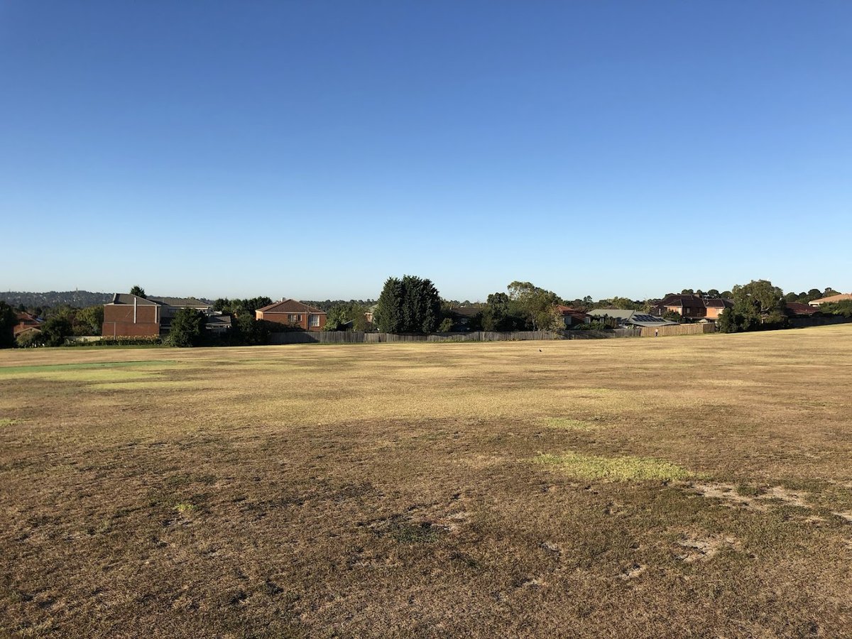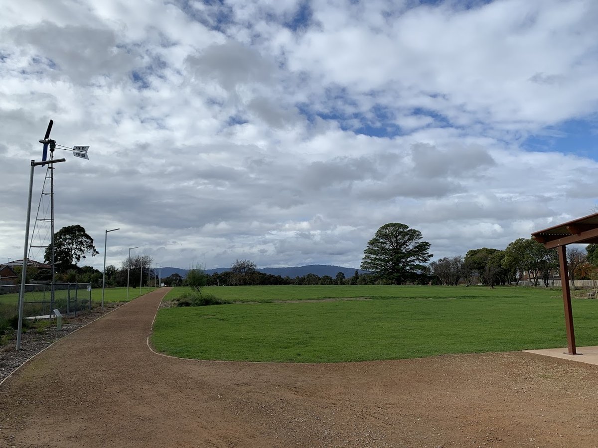 Davy Lane Dog Off Leash Area is an expansive, multi-purpose recreational space located in a suburban setting in Australia. The park is characterized by its vast, open grassy fields that provide ample room for dogs to run and play freely. The terrain is mostly flat but includes some gently sloping areas and wooded sections with mature trees that offer natural shade. A well-maintained dirt and gravel walking path circles part of the perimeter, making it popular for walkers and joggers as well. Facilities include a sheltered pavilion area and tall floodlights, suggesting the park is accessible during early morning or evening hours. While the area is largely bordered by the fences of adjacent residential properties, creating a sense of enclosure, it functions as a designated off-leash zone. The park also features a fenced community garden and is situated near local buildings, possibly a sports pavilion. The overall atmosphere is peaceful and community-oriented, offering a large, natural environment for exercise and socialization without the constraints of small, fenced-in dog runs.