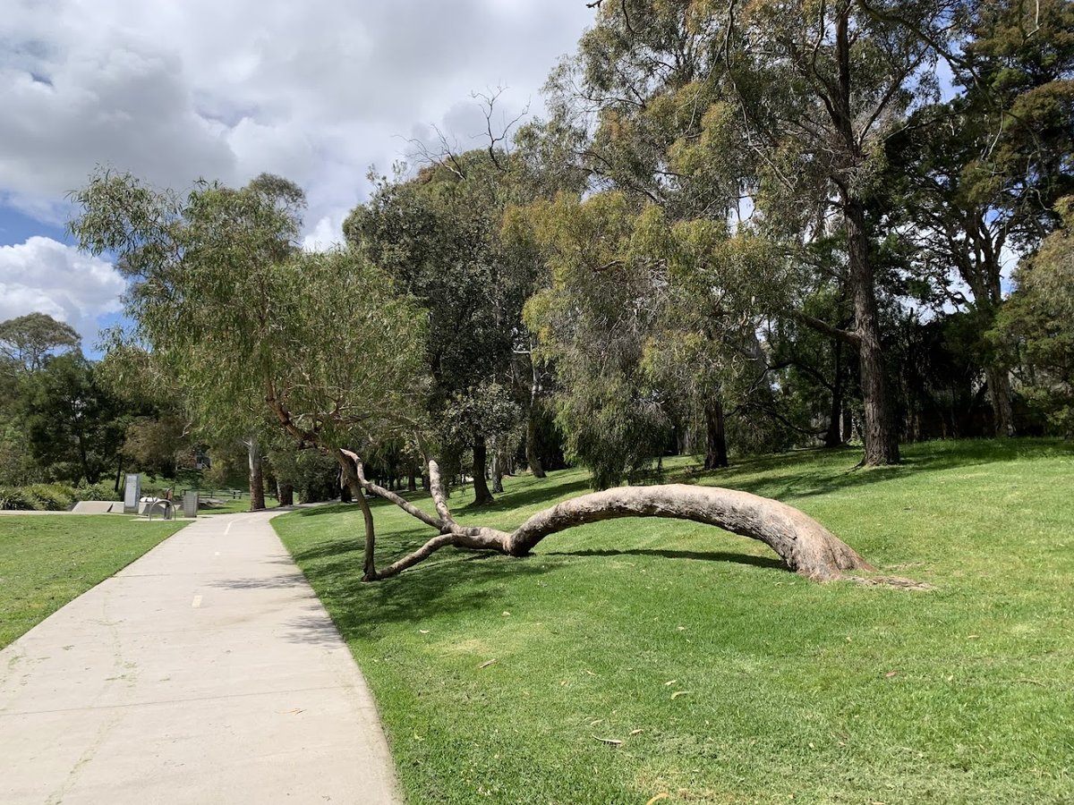Burke Road South Reserve Dog Off Leash Area is a sprawling public park in Australia, primarily characterized by its expansive, well-manicured grass sports fields. The reserve offers a versatile environment for dog owners, featuring large, flat open spaces perfect for high-energy activities like fetch, as well as more secluded, sloped areas with mature eucalyptus trees that provide ample natural shade. A significant portion of the park consists of a large sports oval with goal posts, which serves as a popular off-leash zone for local residents. For families, there is a dedicated, fenced-in playground area equipped with a modern shade sail and play structures. A network of paved walking paths winds through the park, making it accessible for strollers and providing a clean surface for walking. While the park is not fully enclosed by a single perimeter fence, it features various types of fencing, including wooden boundary fences and metal playground barriers. The overall atmosphere is peaceful and community-focused, offering a blend of structured sports facilities and natural parkland for dogs to explore.